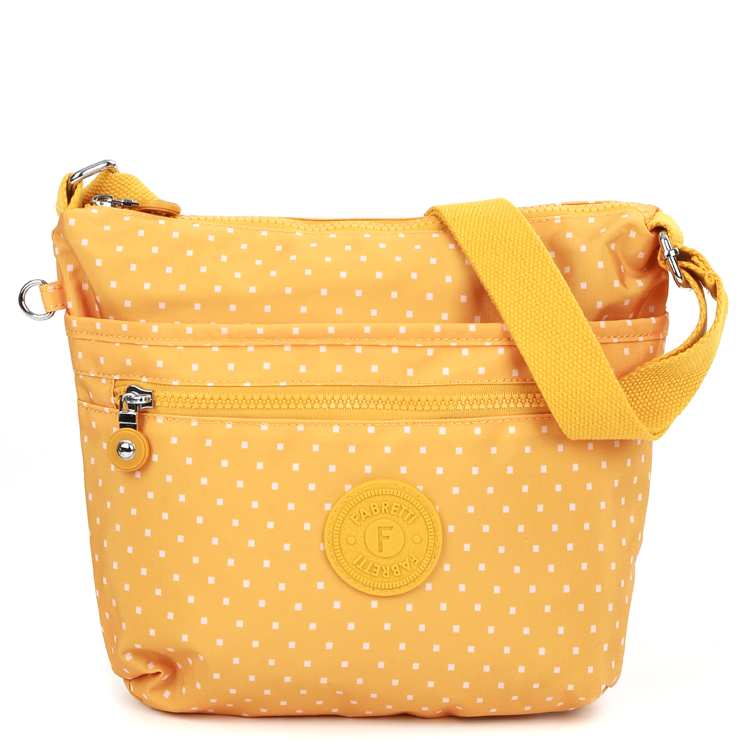Текстильная сумка кросс-боди FABRETTI в желтом оттенке выполнена из высокотехнологичного влагостойкого полиэстера. Он практичен и прост в уходе. В качестве декора выбран принт в виде повторяющихся маленьких прямоугольников, издалека создающих визуальный эффект мелкого гороха. Основное отделение закрывается на молнию с удобным поводком. Внутри есть 3 боковых кармана для мелочей: 2 открытых и на молнии. Карабин на шнурке поможет быстро найти ключи в сумке. На лицевой стороне расположены 2 вместительных кармана на молнии. На тыльной стороне предусмотрен вместительный карман быстрого доступа на молнии. Текстильный плечевой ремень регулируется по длине, ширина - 3 см.