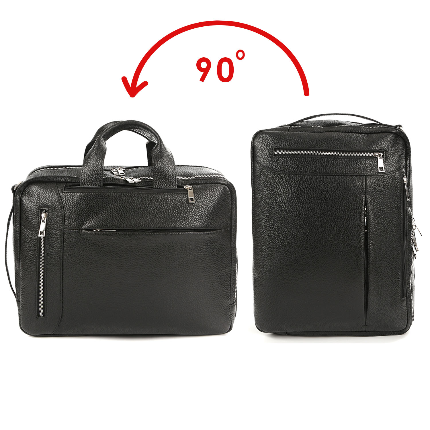Рюкзак-сумка FABRETTI с 2 отделениями на молнии выполнен из натуральной зернистой кожи в черном цвете. Внутри одного отделения находятся открытый карман на липучке для ноутбука, 3 боковых кармана: 2 открытых и на молнии. Снаружи на лицевой стороне есть скрытый карман на молнии, 2 врезных кармана на молнии, в одном из которых ручка для ношения в руках. На тыльной стороне предусмотрены 2 кармана быстрого доступа на молнии: в одном из них находится ручка для ношения аксессуара в руках, в другом – полукольца для пристегивания ремней-лямок рюкзака. Сбоку есть маленький открытый карман. Имеется ручка для переноски рюкзака-сумки в вертикальном положении и 2 ручки для использования изделия в качестве вместительной мужской сумки. Карманы под ручками застегиваются на магнитные кнопки внутри. В комплекте предусмотрены 2 съемных регулируемых ремня (длина - 115 см, ширина - 4 см), которые карабинами пристегиваются к изделию и позволяют использовать его как рюкзак или сумку. Вмещает формат А4. Цвет фурнитуры – серебро.