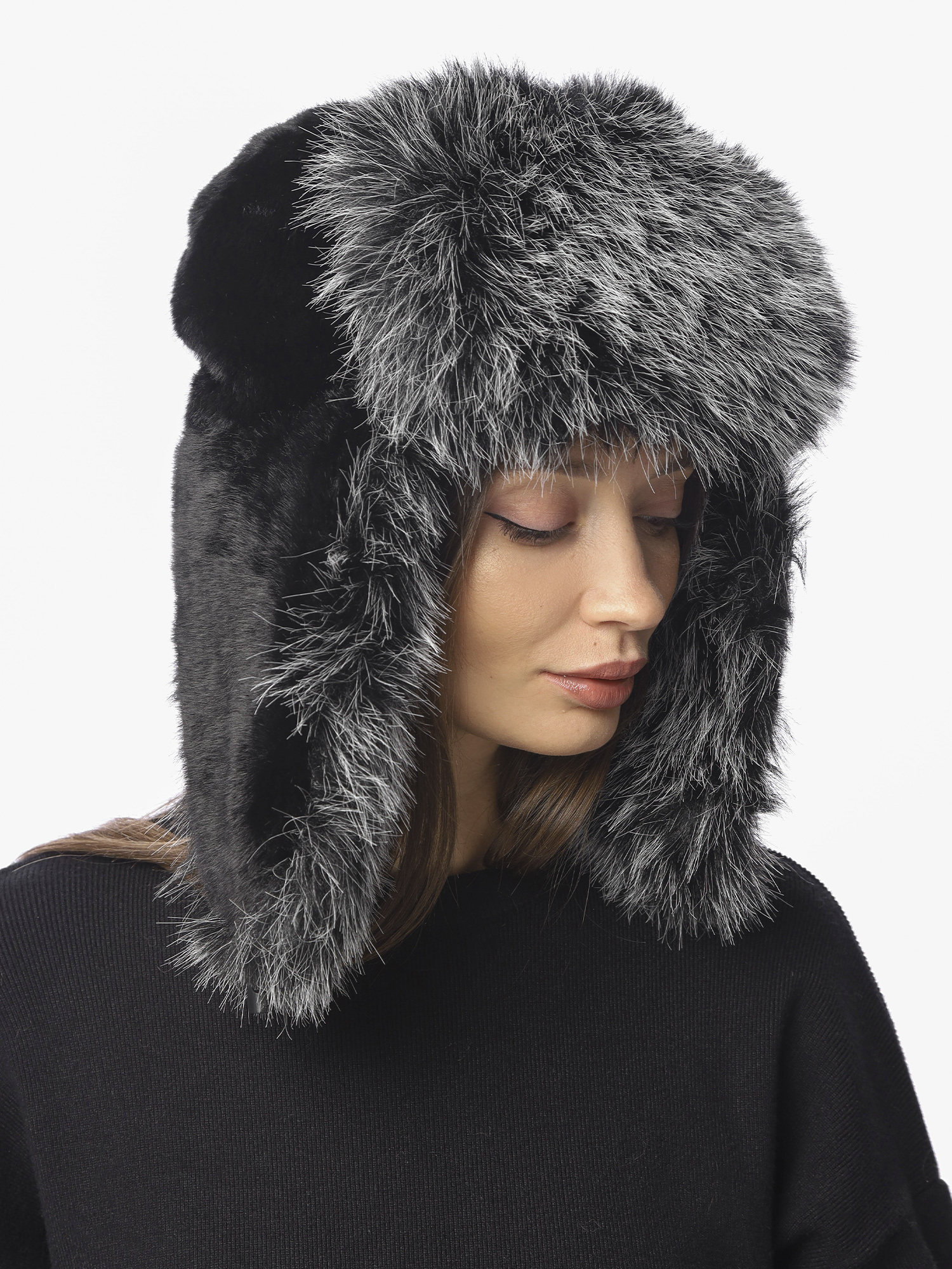 Шапка дополнена специальным ремешком, который может фиксироваться в трех положениях: сзади, под подбородком или вы можете носить шапку с расстегнутыми ушками. Верх ушанки выполнен из черного экомеха «под кролика», а отворот и ушки – из пушистого двухцветного экомеха «под песца».