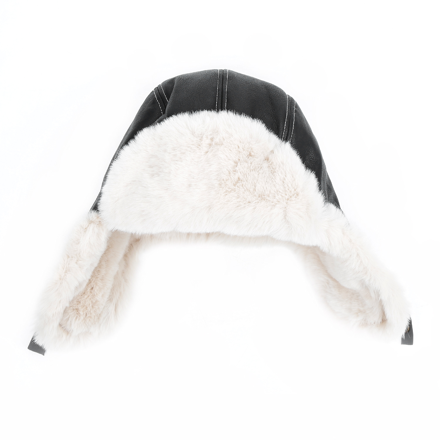 Шапка дополнена специальным ремешком с кнопками, который может фиксироваться в трех положениях: сзади, под подбородком или вы можете носить шапку с расстегнутыми ушками. Верхняя часть шапки выполнена из черной экокожи, а отворот и ушки – из пушистого белого экомеха «под кролика».