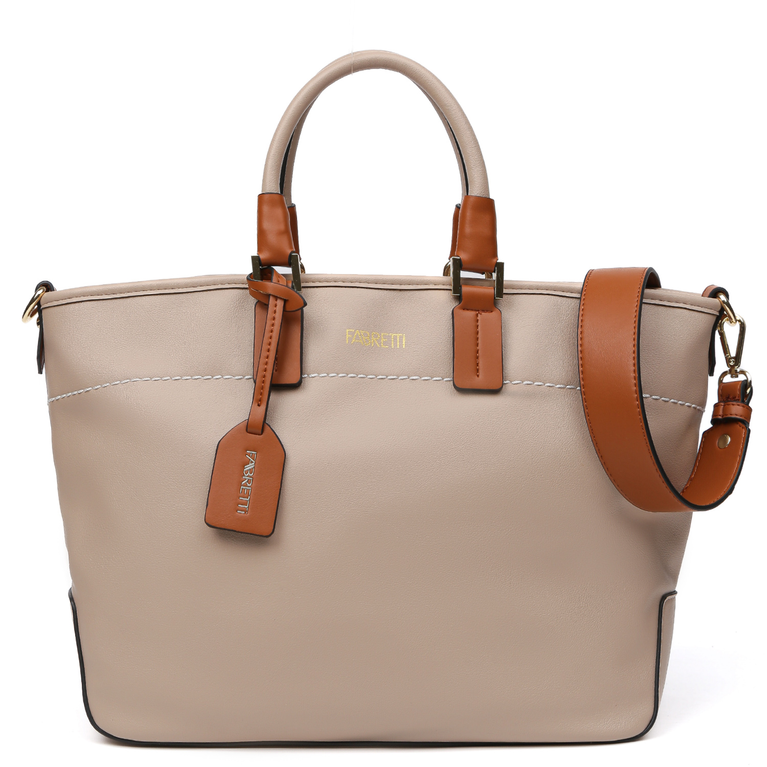Стильная сумка-тоут FABRETTI выполнена из экокожи, фактура которой максимальна приближена к натуральной коже гладкой плотной фактуры. В дизайне сочетаются 2 оттенка бежевого. Внутри 2 отдела, разделенные карманом на молнии, а также 3 кармана для мелочей: 2 открытых и на молнии. На тыльной стороне предусмотрен карман быстрого доступа на молнии. Дно сумки защищают 4 металлические ножки. Две ручки позволяют комфортно носить аксессуар в руке. Плечевой ремень съемный, ширина - 3,5 см. Вмещает формат А4. Цвет фурнитуры - золото.