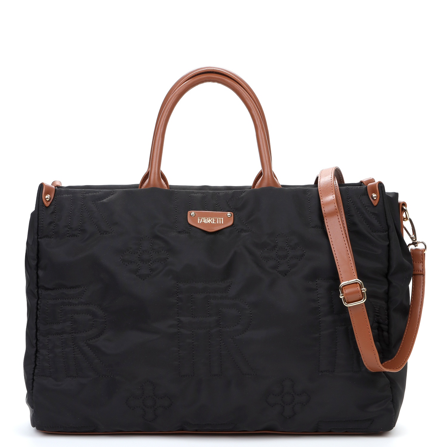 Стёганая сумка-тоут итальянского бренда FABRETTI в чёрном оттенке выполнена из высококачественного полиэстера, устойчивого к влаге и перепадам температур. Средний размер модели делает её удобной для повседневного использования. Ручки, плечевой ремень и детали отделки выполнены из экокожи коричневого оттенка. Основное отделение закрывается на молнию. Внутри два небольших кармана: один открытый и один на молнии. На тыльной стороне — карман быстрого доступа на молнии. В комплекте съёмный регулируемый ремешок длиной от 73 до 134 см, ширина — 1,8 см.