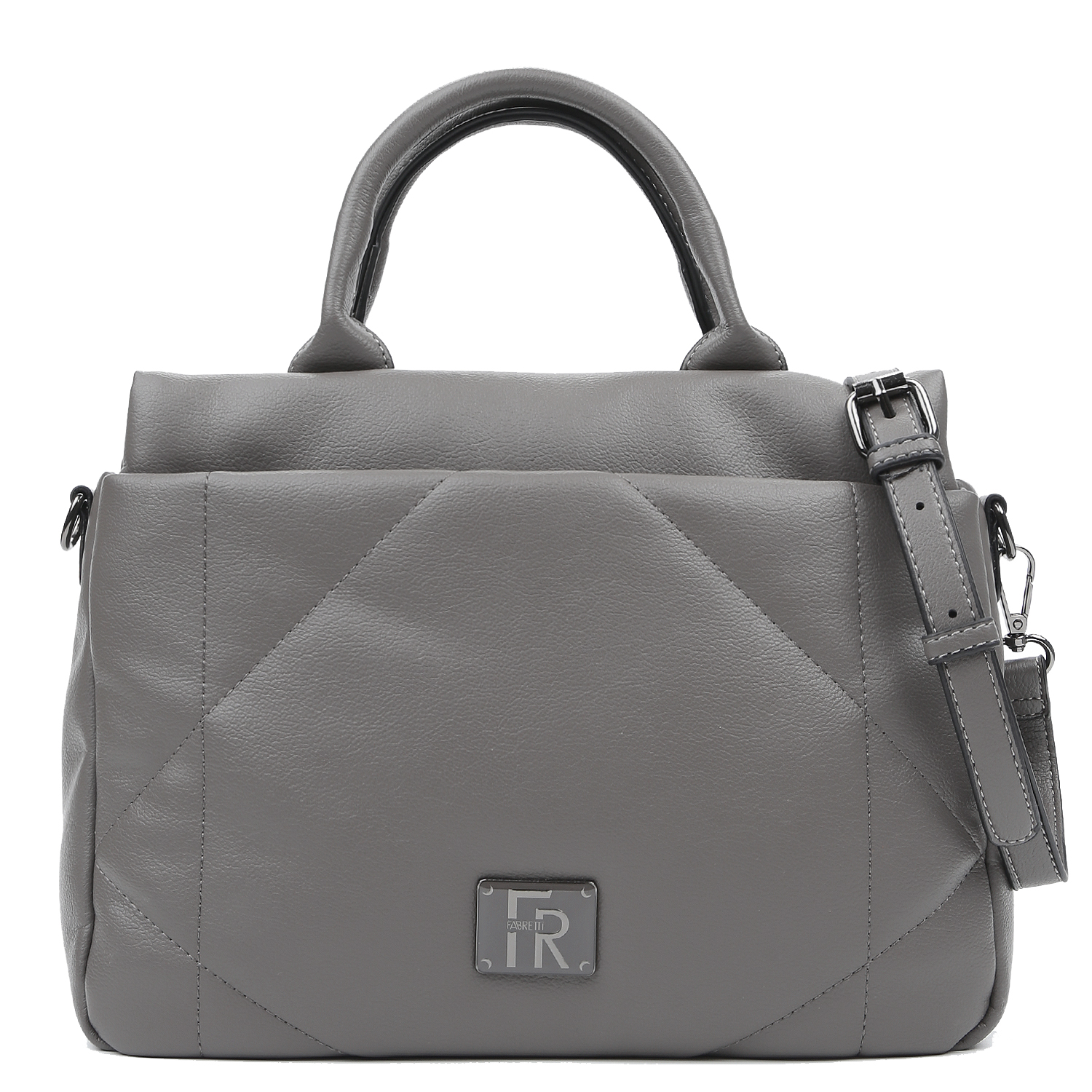 Стеганая сумка тоут среднего размера итальянского бренда FABRETTI в сером оттенке выполнена из экокожи с мелкозернистой текстурой. Модель с короткими ручками и съемным регулируемым ремешком длиной от 123 до 140 см, ширина — 2 см. Основное отделение закрывается на молнию, рядом находится вместительное дополнительное отделение на молнии. Внутри два небольших открытых кармана и один карман на молнии. На тыльной стороне — карман быстрого доступа на молнии.
