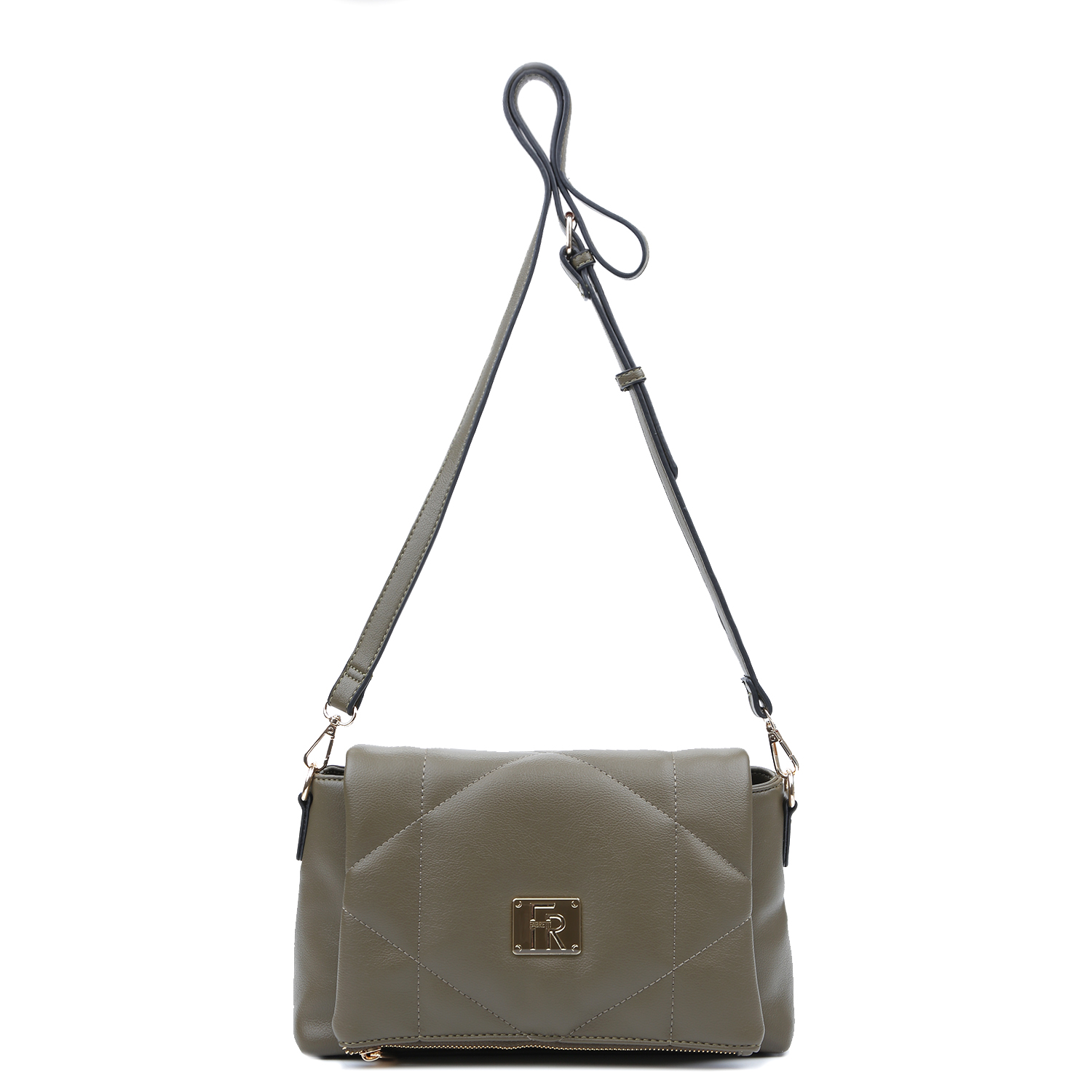 Стеганая, небольшая сумка кросс-боди итальянского бренда FABRETTI выполнена из экокожи с мелкозернистой текстурой в оттенке хаки. Съёмный регулируемый ремешок длиной от 124 до 140 см, ширина — 1,8 см, позволяет подобрать комфортную посадку. Основное отделение закрывается на молнию и клапан с магнитами. Внутри — один небольшой открытый карман и один карман на молнии. В клапане расположено просторное дополнительное отделение на молнии. На тыльной стороне — карман быстрого доступа на молнии.