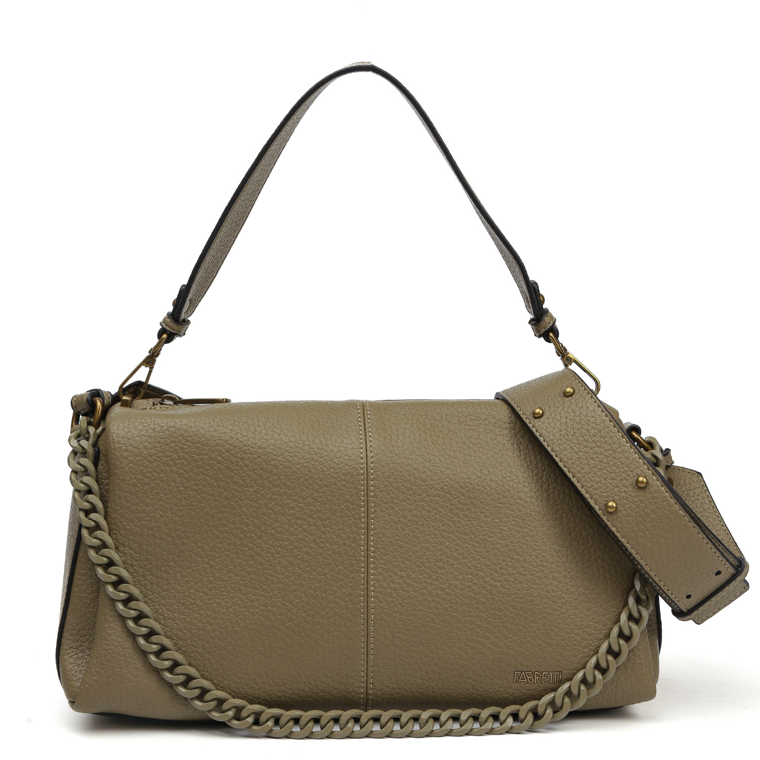 Вместительная сумка на плечо FABRRETTI в зеленом оттенке выполнена из экокожи зернистой текстуры. Просторное отделение закрывается на молнию с металлическим поводком. Внутри 3 кармана для мелочей: 2 открытых и на молнии. На тыльной стороне предусмотрен карман быстрого доступа на молнии. В качестве декора выступает цепочка со средними звеньями в тон изделия. Два съемных плечевых ремня, шириной 3,5 и 4,5 см, регулируются по длине. Цвет фурнитуры - бронза.