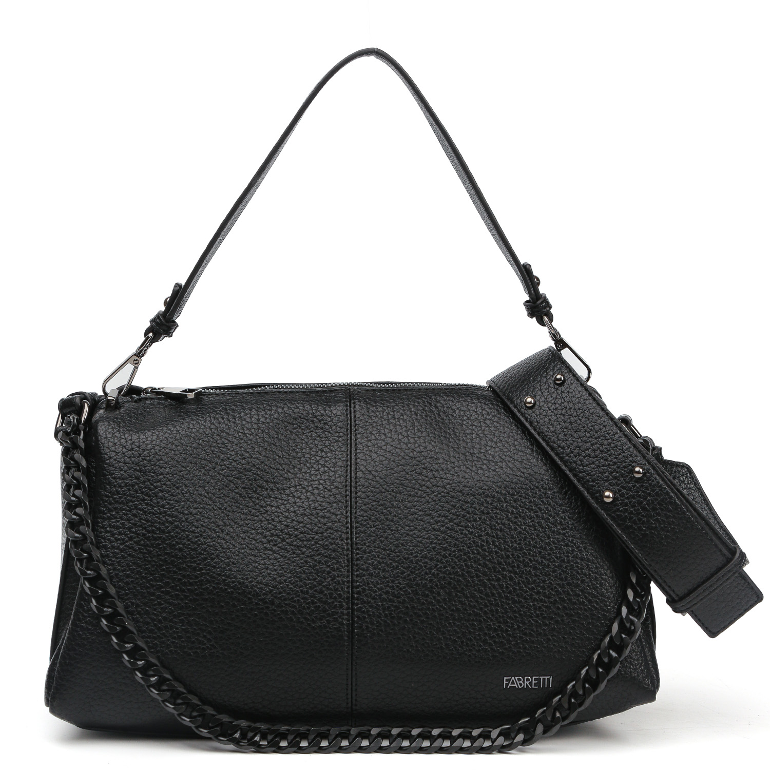 Вместительная сумка на плечо FABRRETTI в черном цвете выполнена из экокожи зернистой текстуры. Просторное отделение закрывается на молнию с металлическим поводком. Внутри 3 кармана для мелочей: 2 открытых и на молнии. На тыльной стороне предусмотрен карман быстрого доступа на молнии. В качестве декора выступает цепочка со средними звеньями в тон изделия. Два съемных плечевых ремня, шириной 3,5 и 4,5 см, регулируются по длине. Цвет фурнитуры - черненый никель.