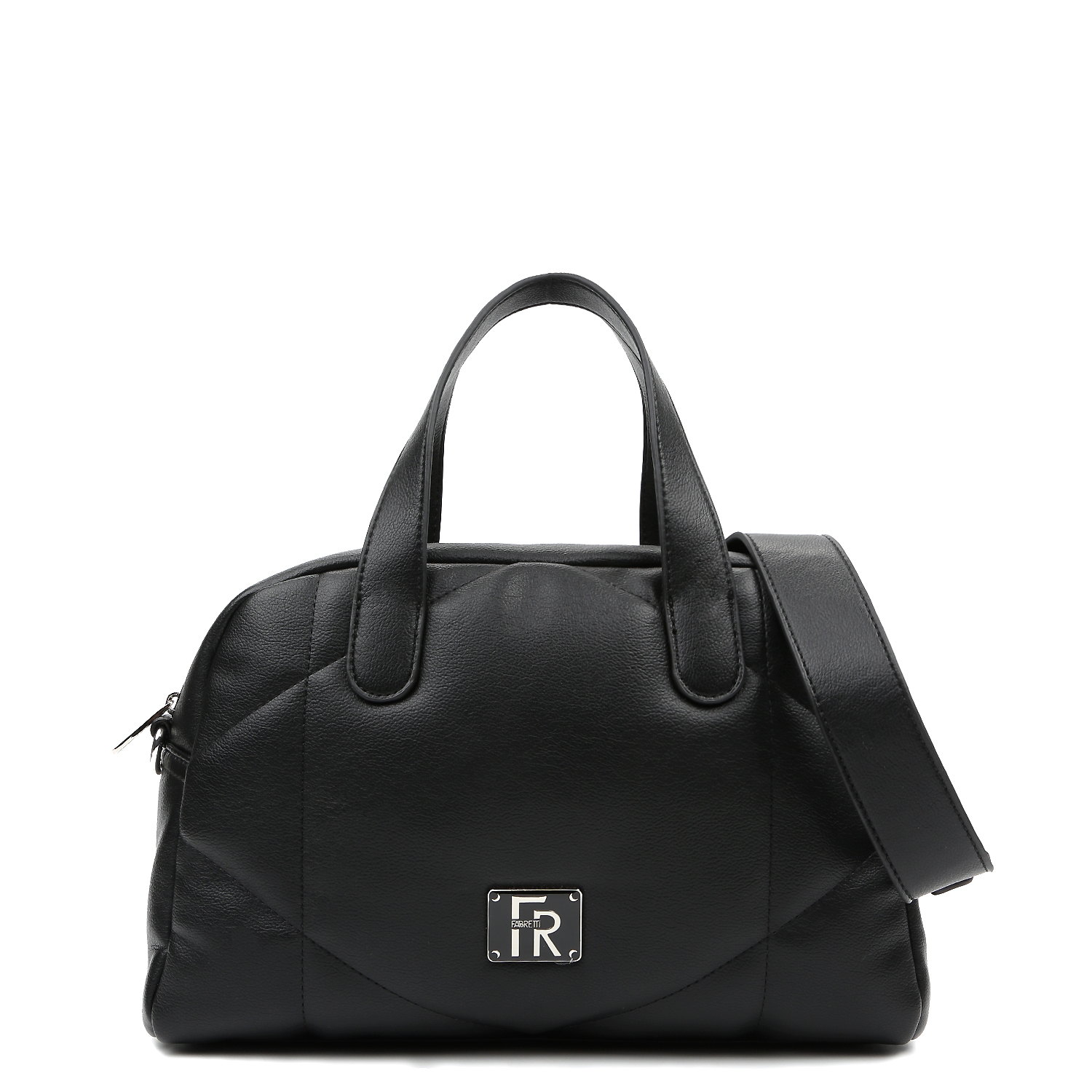 Стеганая сумка боулер среднего размера итальянского бренда FABRETTI выполнена из экокожи с мелкозернистой текстурой в чёрном оттенке. Модель с маленькими ручками и съёмным нерегулируемым ремешком длиной 111 см, ширина — 3,8 см. Основное отделение закрывается на молнию. Внутри расположены два небольших открытых кармана и один карман на молнии. На тыльной стороне — карман быстрого доступа на молнии.