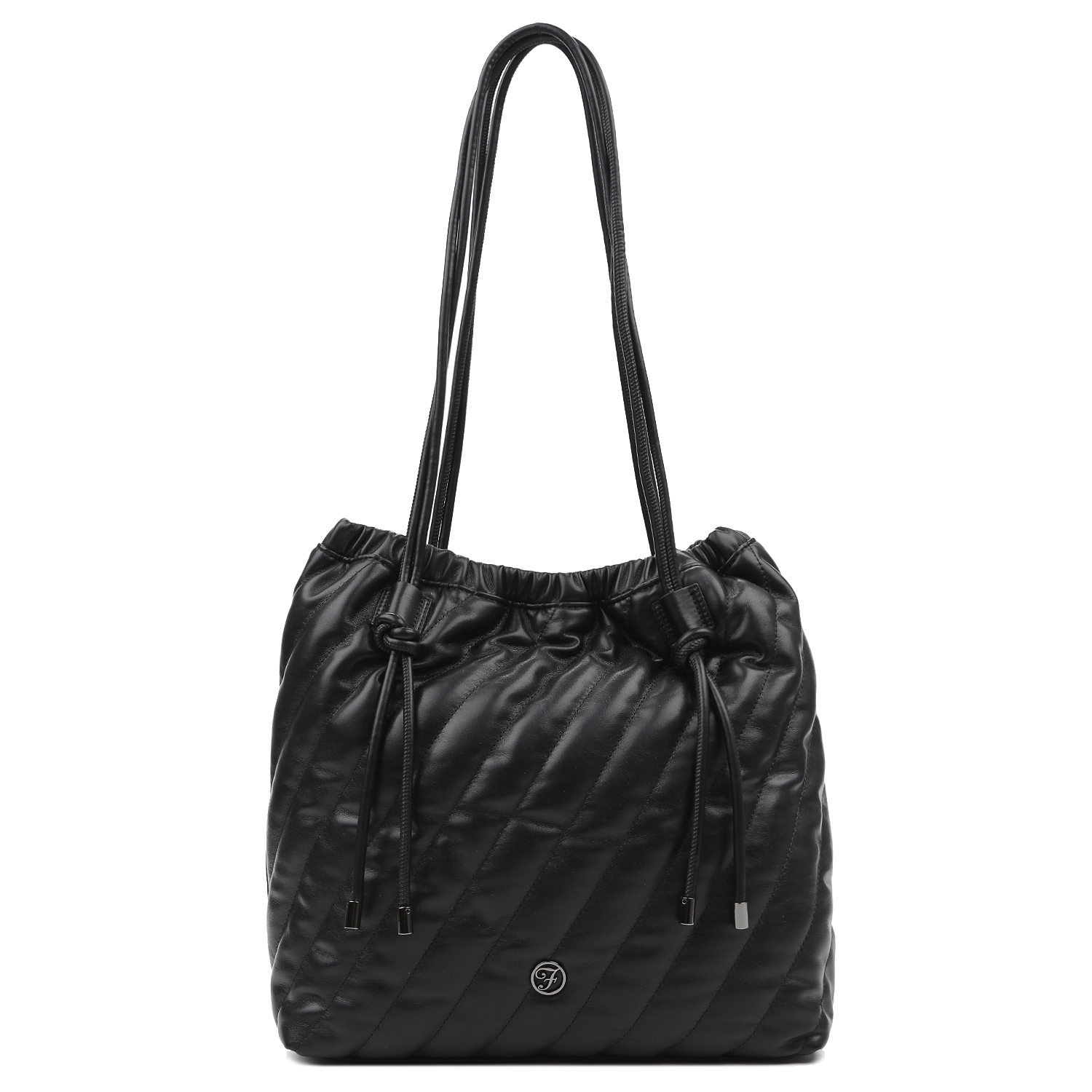 Стеганая сумка-мешок среднего размера итальянского бренда FABRETTI выполнена из экокожи чёрного оттенка. Оснащена четырьмя съёмными тонкими ручками длиной по 115 см с декоративными завязками у основания. Основное отделение закрывается на молнию и оформлено мягкой сборкой на резинке. Внутри расположены открытый карман и карман на молнии. Цвет фурнитуры — чёрный никель. Универсальный вариант для повседневных образов.