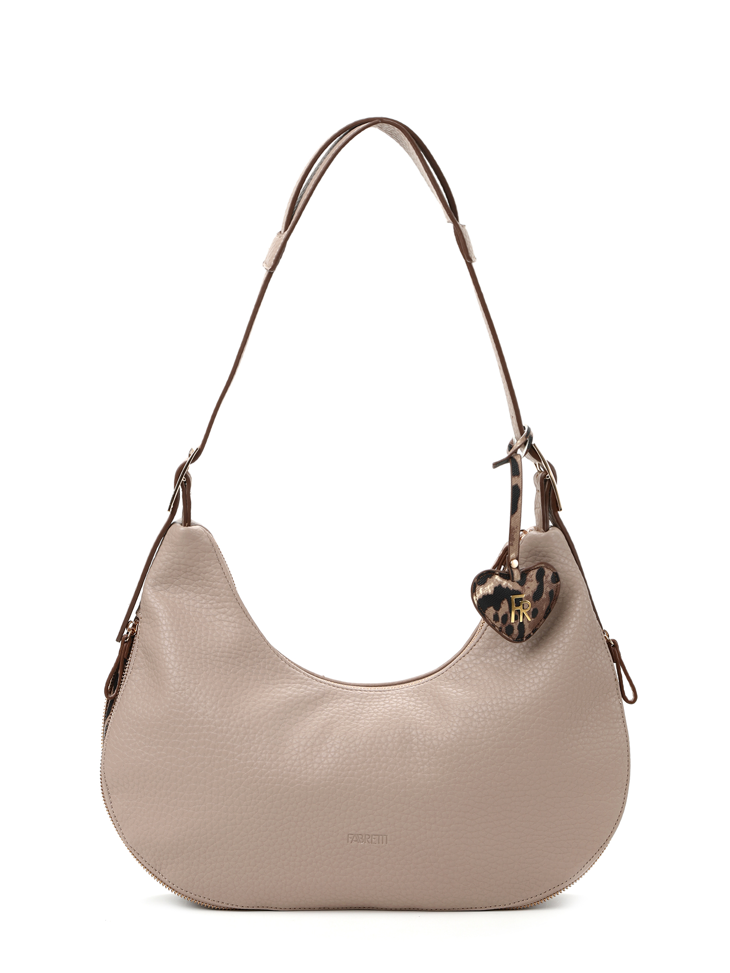 У сумки классическая форма полумесяца, компактная и удобная в носке, но низ дополнен молнией со вставкой-расширителем со смелым «леопардовым» узором. Тем же узором украшен и съемный брелок-сердечко на ручке.
