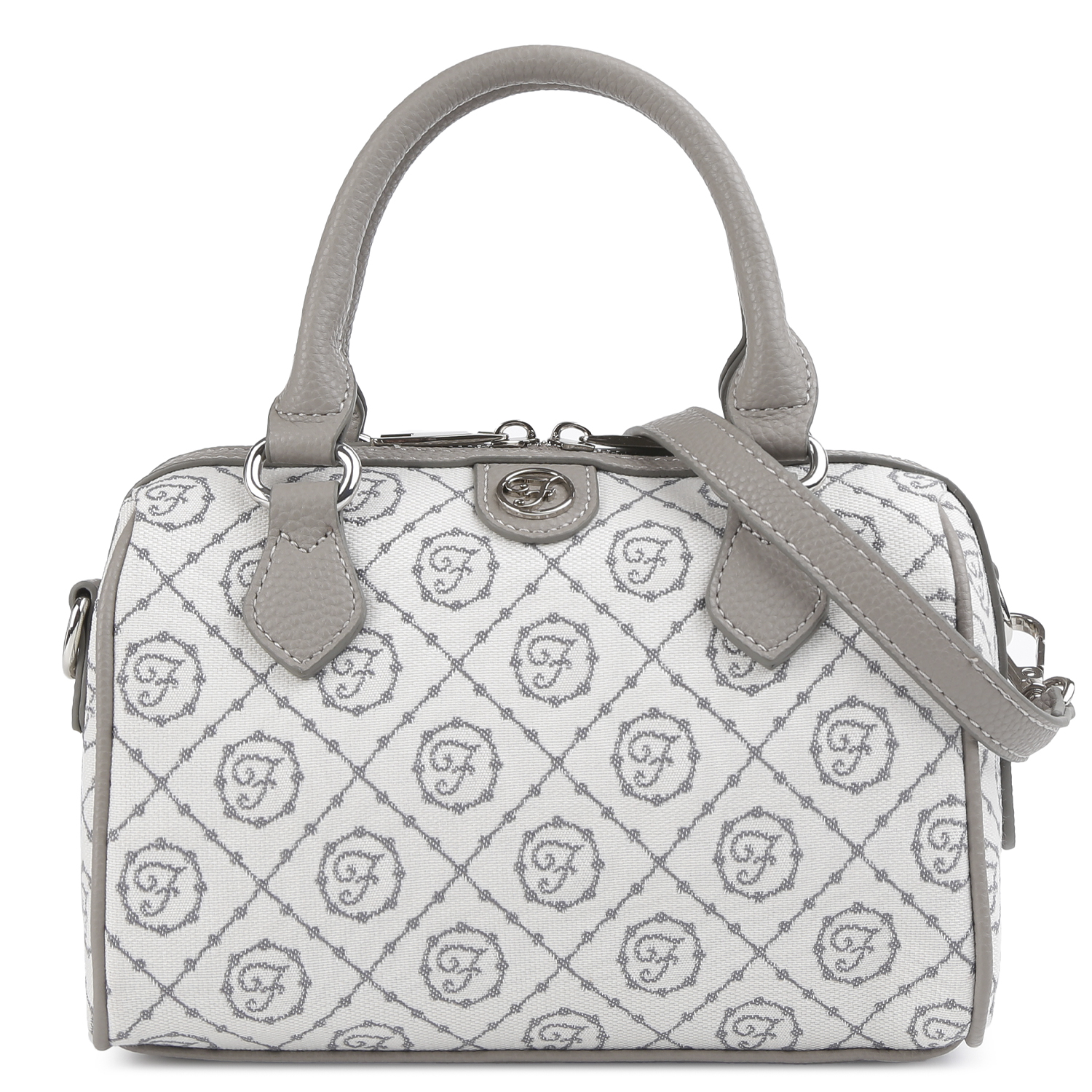 Миниатюрная женская сумка кросс-боди итальянского бренда FABRETTI в светло-сером оттенке с серой отделкой декорирована узором в стиле «Логомания». Сумка выполнена из высокотехнологичного полиэстера с фактурой гобелен, устойчивого к воздействию влаги и перепаду температур. Ручки и элементы отделки выполнены из экокожи. Основное отделение закрывается на полукруглую молнию. Внутри 2 боковых кармана для мелочей: открытый и на молнии. На тыльной стороне расположен карман быстрого доступа на молнии. В комплект входит съемный плечевой ремень из экокожи, длина которого регулируется, ширина – 1,5 см. Цвет фурнитуры - серебро.