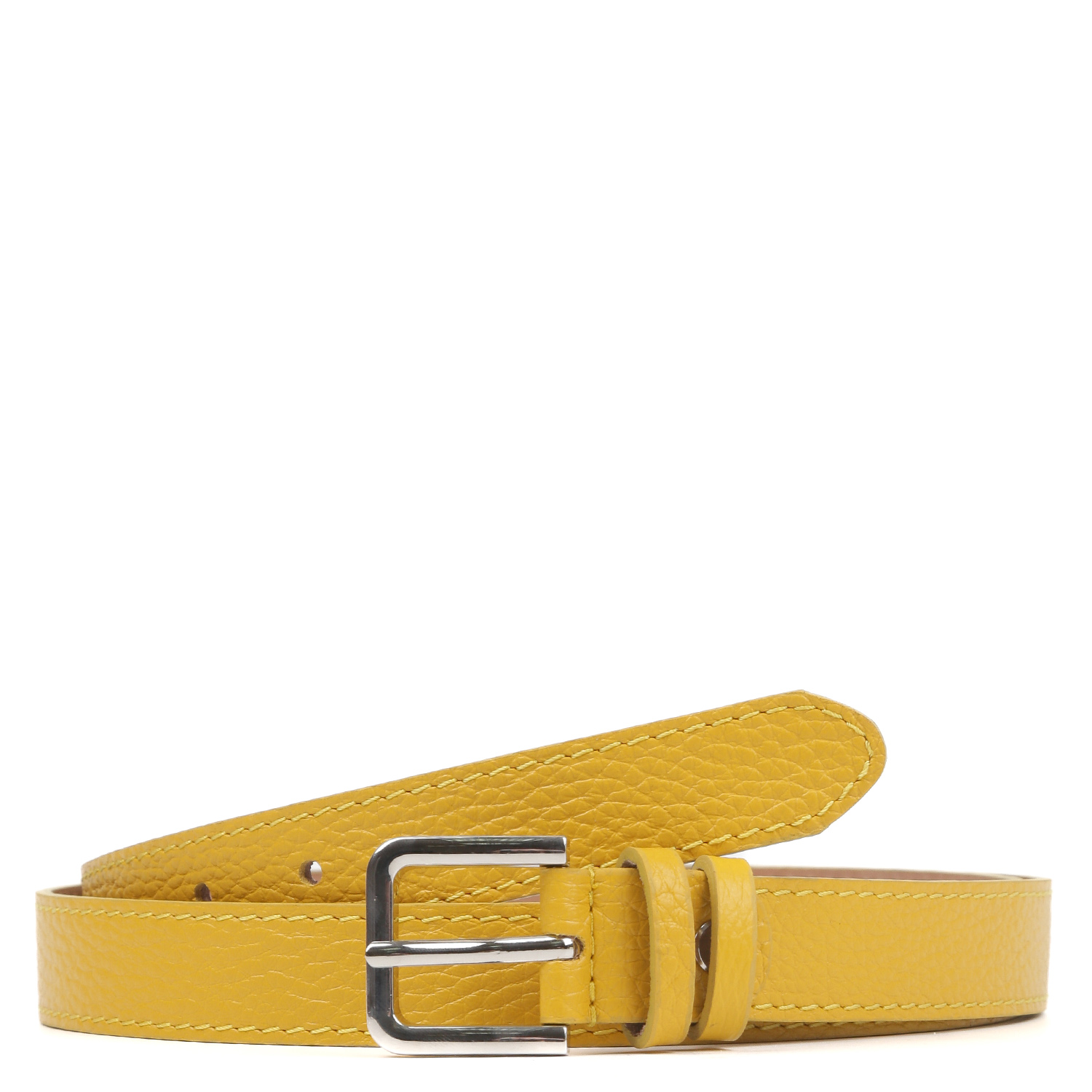 Стильный ремень FABRETTI в жёлтом оттенке выполнен из мягкой зернистой кожи и декорирован отстрочками - по одной с каждого края. Тыльная сторона - из гладкого плотного спила. Модель дополнена прямоугольной пряжкой из прочного гальванического сплава с покрытием - серебро. Пряжка крепится к изделию с помощью винта, что позволяет легко отрегулировать длину. Две шлевки из зернистой кожи в тон изделию: одна закреплена, вторая - подвижная.