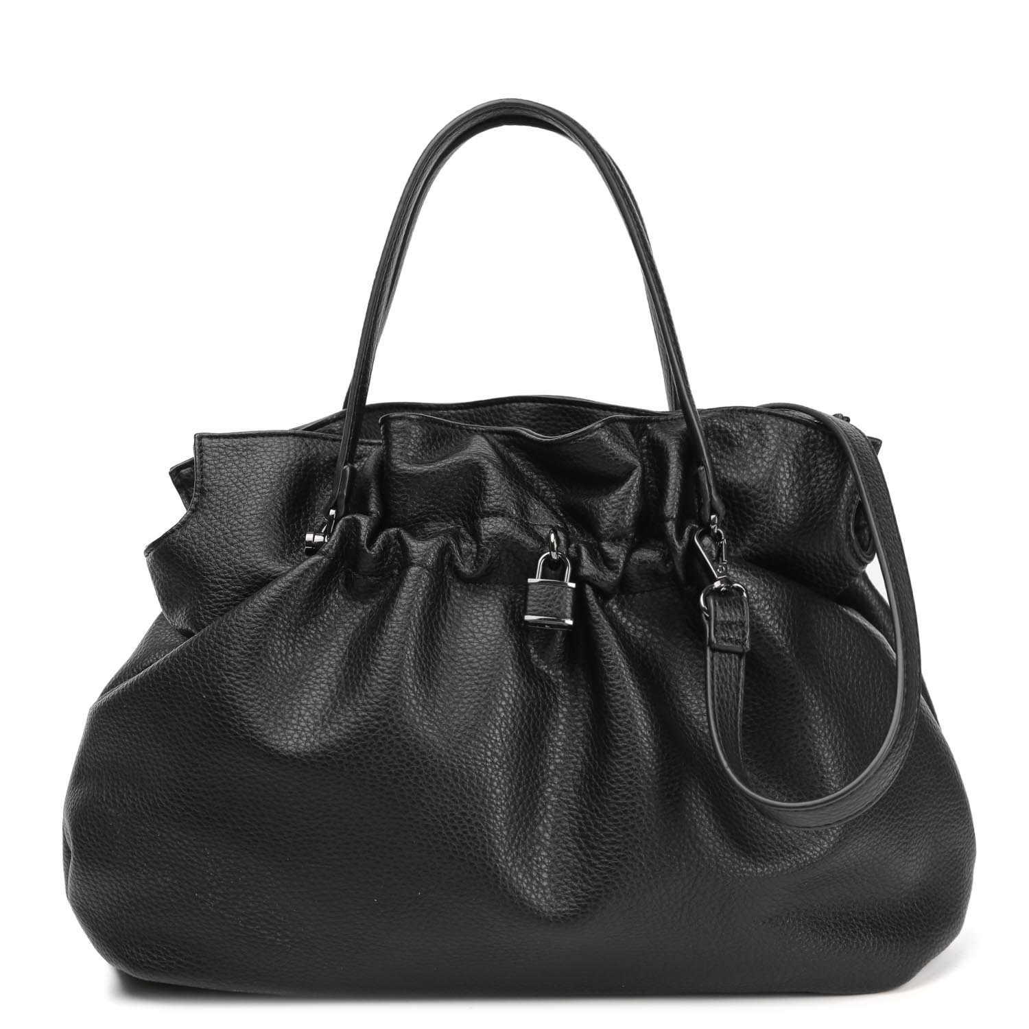 Вместительная сумка-тоут FABRETTI в черном цвете выполнена из экокожи зернистой текстуры. Основное отделение закрывается на молнию с металлическим поводком. Внутри 2 отдела, разделенные средником на молнии, а также 3 кармана для мелочей: 2 открытых и на молнии. Лицевая сторона декорирована подвеской в виде замочка. Верхние края немного присборены и образуют мягкие волны. Две ручки позволяют комфортно носить аксессуар в руке. Съемный плечевой ремень регулируется по длине, ширина - 1,5 см. Вмещает формат А4. Цвет фурнитуры - черненый никель.