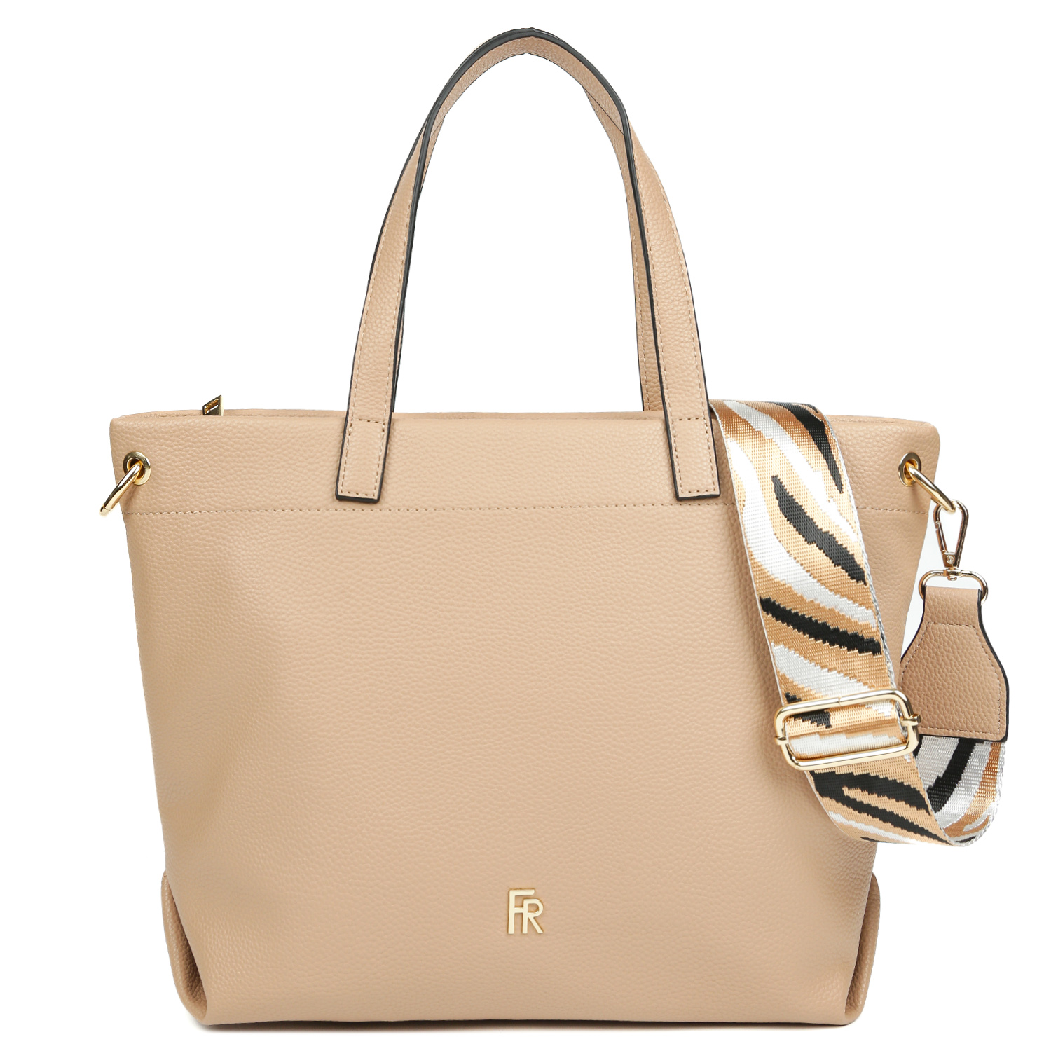 Стильная сумка-тоут FABRETTI в бежевом оттенке выполнена из экокожи зернистой фактуры. Просторное отделение закрывается на молнию с металлическим поводком. Внутри 3 боковых кармана: 2 открытых и 1 на молнии. На тыльной стороне расположен карман быстрого доступа на молнии. Две ручки позволяют носить сумку в руке. В комплекте идёт съемный текстильный ремень, регулируемый по длине, ширина - 5 см. Модель вмещает формат А4. Цвет фурнитуры - золото.
