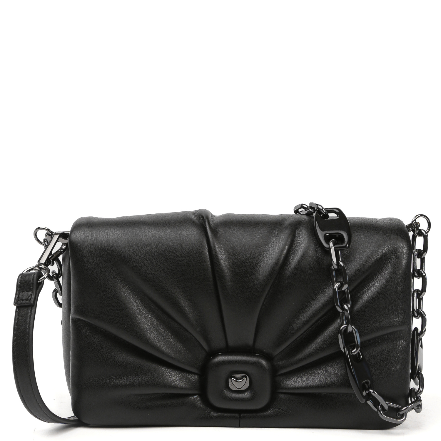 Оригинальная сумка кросс-боди FABRETTI в черном цвете выполнена из экокожи нежной гладкой текстуры. Сумка закрывается клапаном на магнитной кнопке. Внутри есть 2 кармана для мелочей: открытый и на молнии. Клапан декорирован изящными сборками и миниатюрным сердечком. Дополняет дизайн съемная плечевая цепочка. В комплекте есть съемный плечевой ремень, длина которого регулируется, ширина - 1,5 см. Сумку можно использовать как клатч или как кросс-боди. Легкая и компактная она вмещает все необходимое: телефон, ключи, банковские карты и необходимые мелочи. Аксессуар станет прекрасным дополнением повседневного образа и наряда для торжественного случая. Цвет фурнитуры - черненый никель.