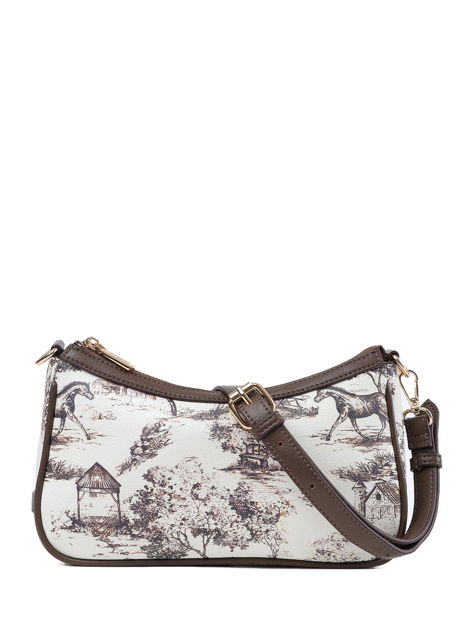 У сумки одно отделение на молнии, внутри открытый карман и на молнии. Поверхность украшена стилизованным принтом в виде сельского пейзажа с лошадьми и колодцем.