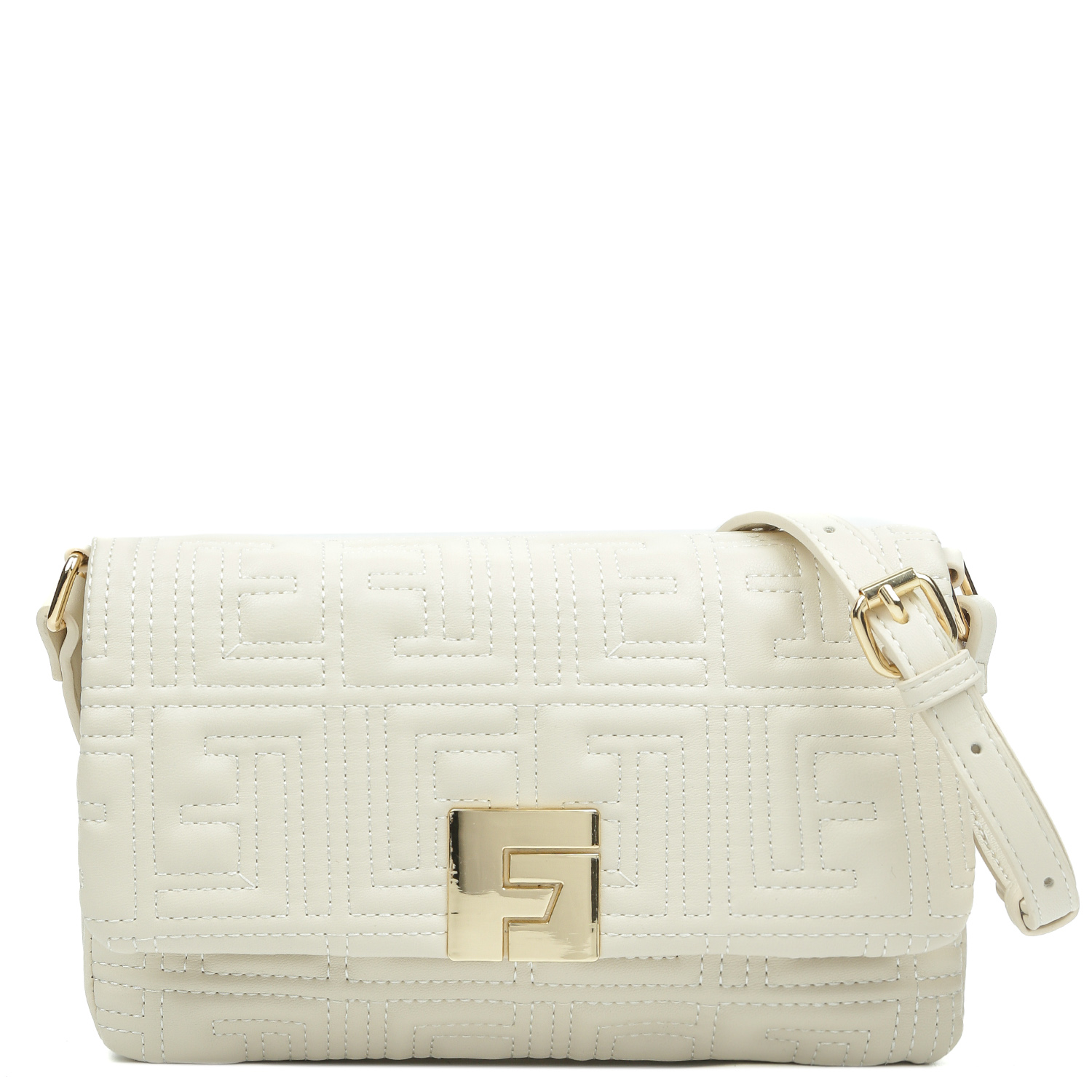 Компактная кросс-боди FABRETTI в светло-бежевом оттенке выполнена из экокожи гладкой фактуры и декорирована стёжкой, изображающей орнамент из монограмм бренда. Сумка закрывается клапаном на магнитной кнопке. Внутри 2 отделения, между которыми расположен открытый карман. В каждом отделении предусмотрено по карману для мелочей: в одном - открытый, в другом - на молнии. Плечевой ремень регулируется по длине, ширина - 1,5 см. Цвет фурнитуры - золото.
