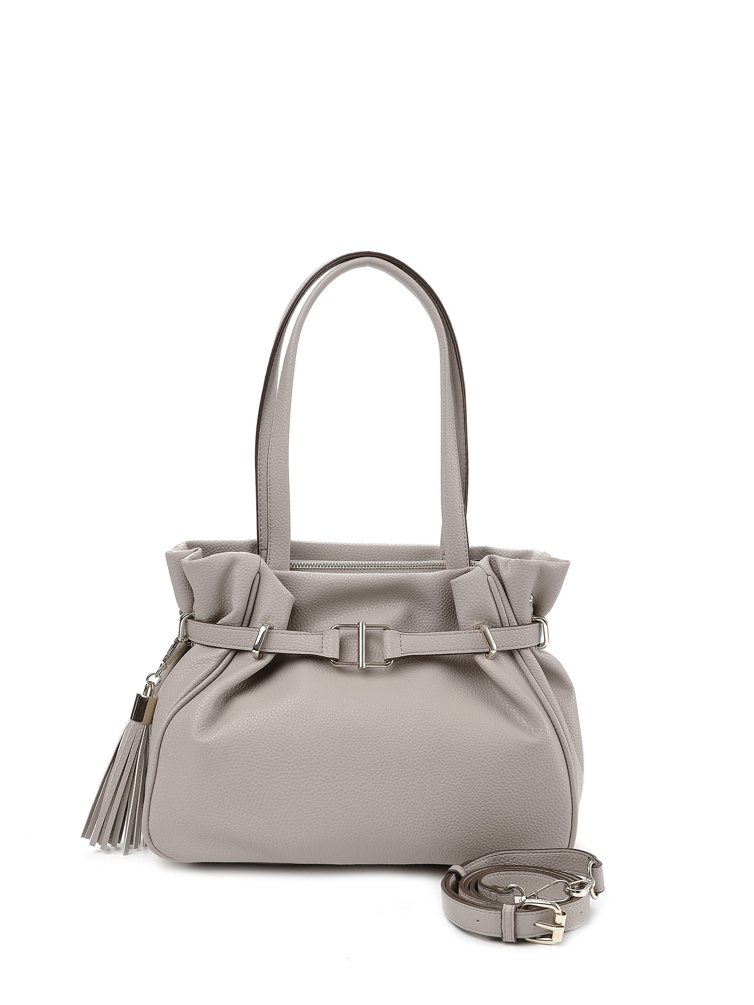 Необычная женская сумка сэтчел итальянского бренда FABRETTI из мягкой и нежной серо-бежевой экокожи с зернистой фактурой делает образ более динамичным и оригинальным благодаря своей нестандартной форме. Декоративный ремень, проходящий под горловиной сумки, создает классическую форму сумки-кисета, дополняет «старинный» дизайн брелок-кисточка на карабине.