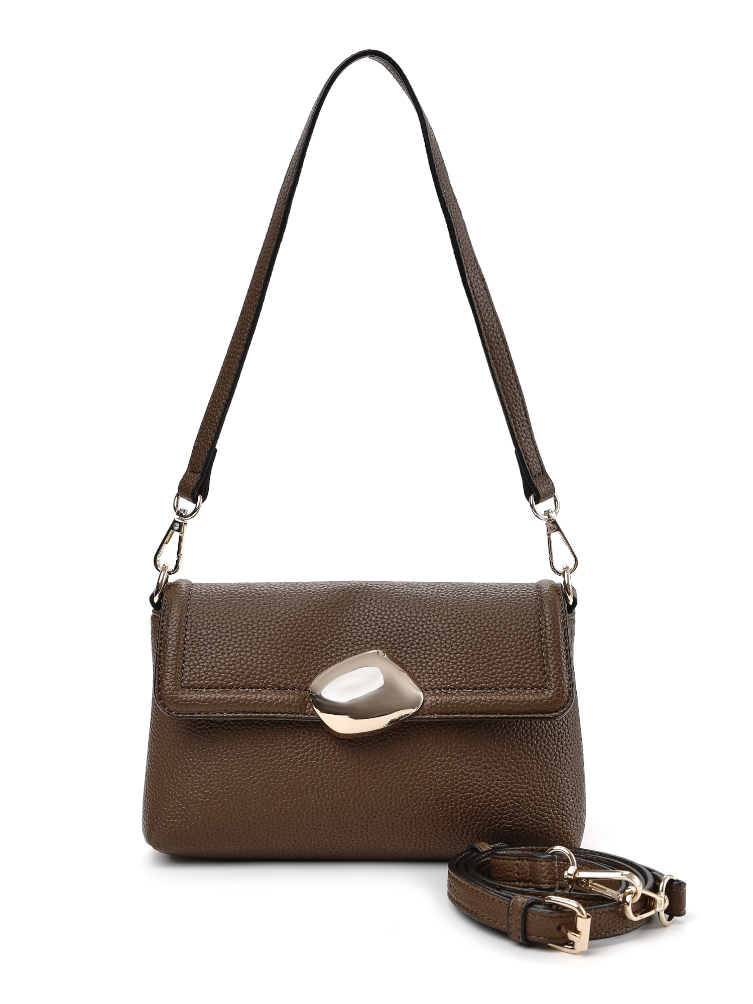 Лаконичная городская сумка кросс-боди итальянского бренда FABRETTI из высококачественной экокожи шоколадного оттенка с зернистой фактурой. Простой классический дизайн делает модель универсальным аксессуаром под любой образ, эффектным акцентом служит объемная металлическая вставка на клапане сумки.