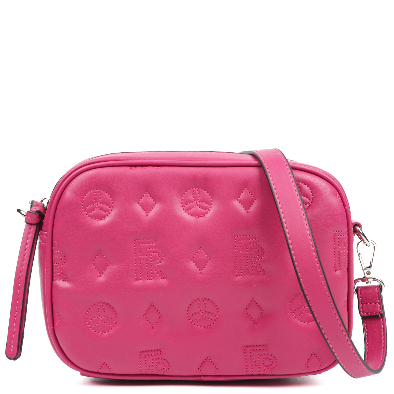 Компактная кросс-боди FABRETTI в оттенке фуксии выполнена из искусственной кожи гладкой фактуры и декорирована стёжкой в стиле Логомания. Сумка закрывается на полукруглую молнию. Внутри 2 боковых кармана для мелочей: открытый и на молнии. В комплект входят 2 съемных плечевых ремня, регулируемых по длине: первый - из гладкой экокожи, ширина - 1,5 см; второй - текстильный, ширина - 5 см. Цвет фурнитуры - золото.