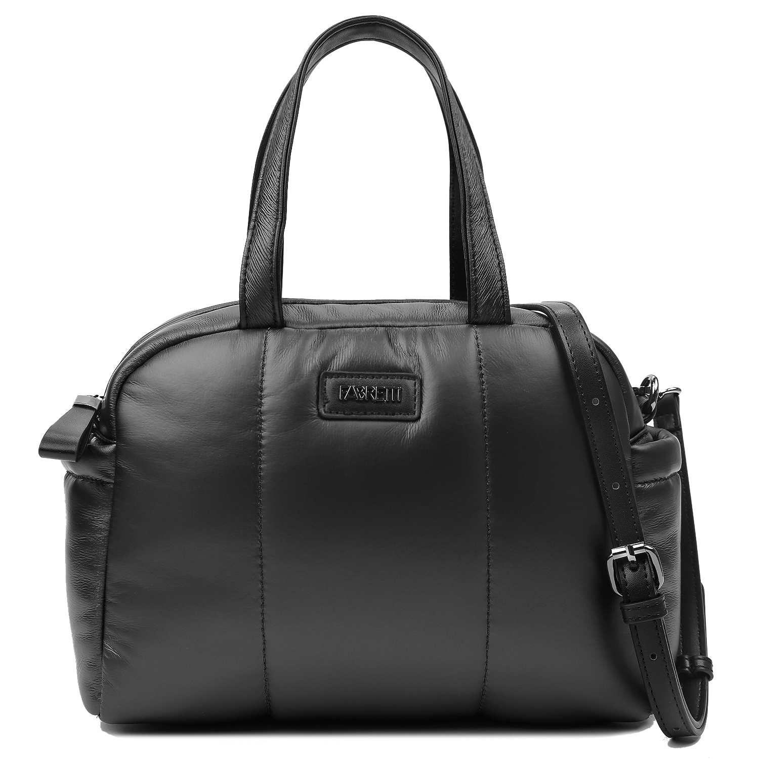 Стеганая сумка-боулер дутик итальянского бренда FABRETTИ выполнена из высокотехнологичного полиэстера, устойчивого к влаге и перепадам температур, в черном оттенке. Основное отделение закрывается на молнию. Внутри расположены небольшие карманы на молнии и открытый карман. По бокам сумки предусмотрены открытые карманы быстрого доступа. Модель оснащена двумя ручками длиной 34 см, а также съёмным регулируемым ремешком длиной 114–134 см и шириной 1,5 см. Цвет фурнитуры — черный никель. Практичный и стильный аксессуар для повседневного использования.
