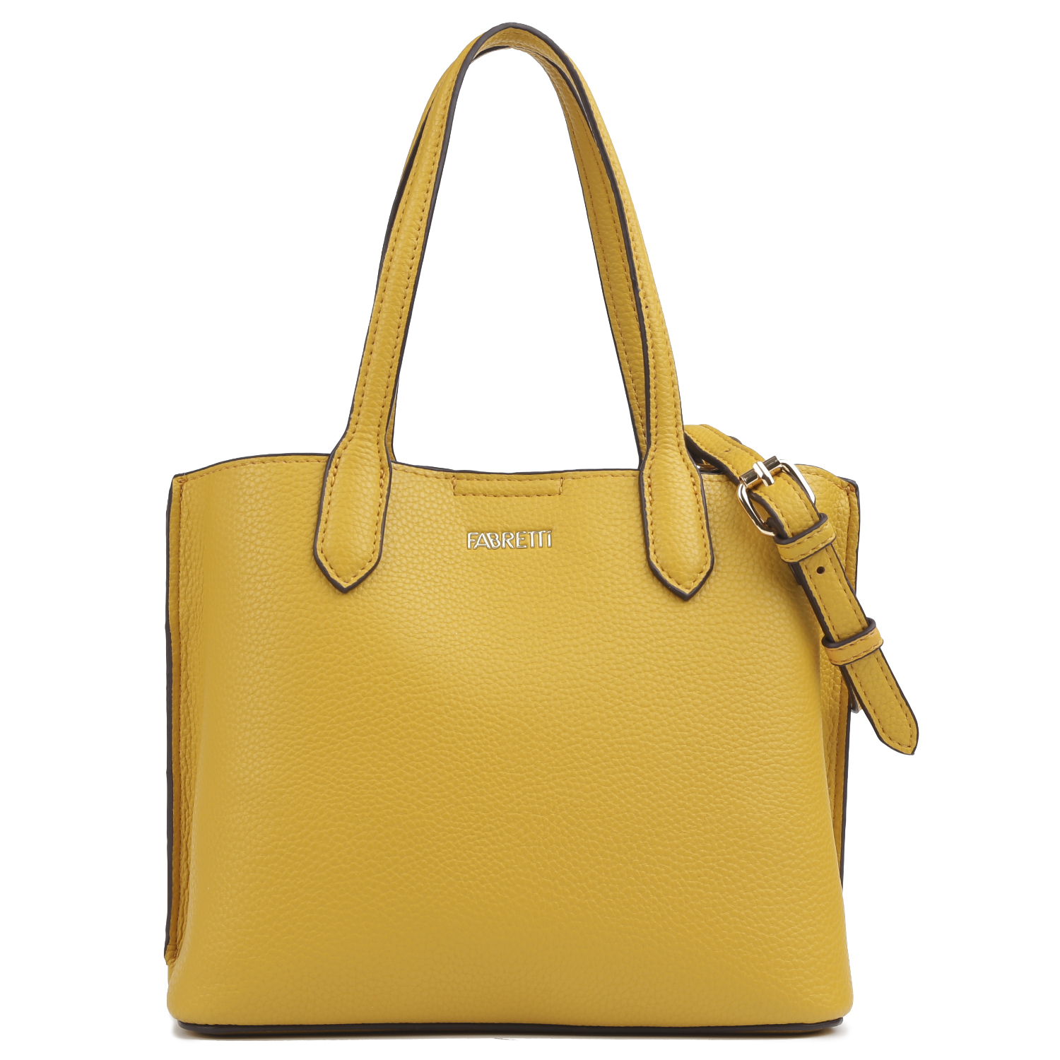Стильная сумка-тоут FABRETTI в желтом оттенке выполнена из высокотехнологичной экокожи с имитацией зернистой фактуры натуральной кожи. Основное отделение закрывается на молнию. Внутри 2 отдела, разделенные карманом на молнии, а также 3 кармана для мелочей: 2 открытых и на молнии. Лицевая сторона декорирована аппликацией с логотипом бренда. На тыльной стороне предусмотрен карман быстрого доступа на молнии. Две ручки позволяют комфортно носить аксессуар в руке. Съемный плечевой ремень регулируется по длине. Цвет фурнитуры - серебро.