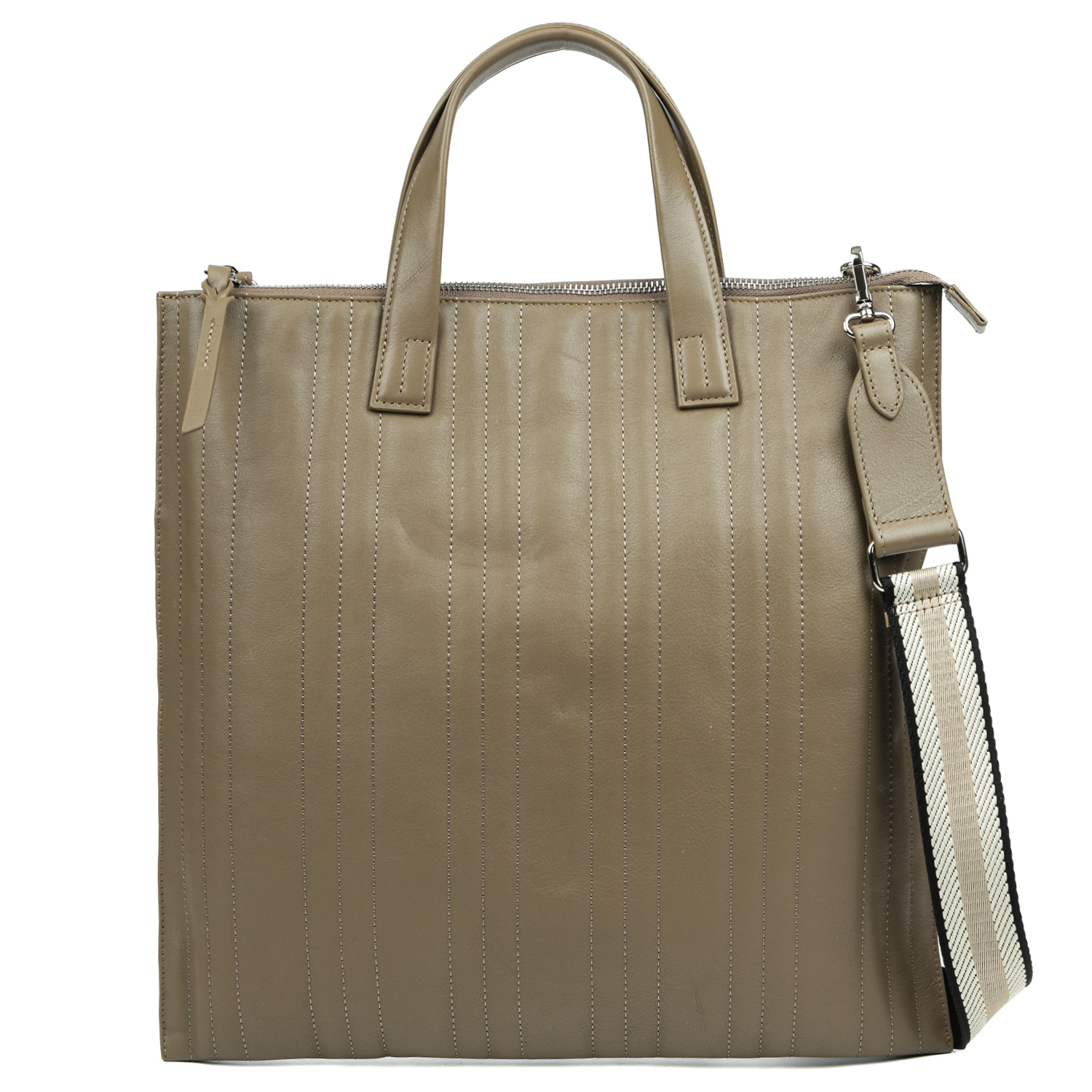 Стильная сумка-шоппер PALIO в бежевом оттенке выполнена из натуральной гладкой кожи и декорирована вертикальной стёжкой. Сумка закрывается на молнию с кожаным поводком. Внутри секция для гаджетов с мягкой стенкой, 4 слота для пластиковых карт, 3 кармана для мелочей: 2 открытых и на молнии. На тыльной стороне предусмотрен карман быстрого доступа на молнии. Две ручки (ширина - 2 см) позволяют комфортно носить аксессуар в руке. В комплекте идет съемный текстильный ремень, регулируемый по длине (ширина – 3,5 см). Модель вмещает формат А4. Цвет фурнитуры - серебро.