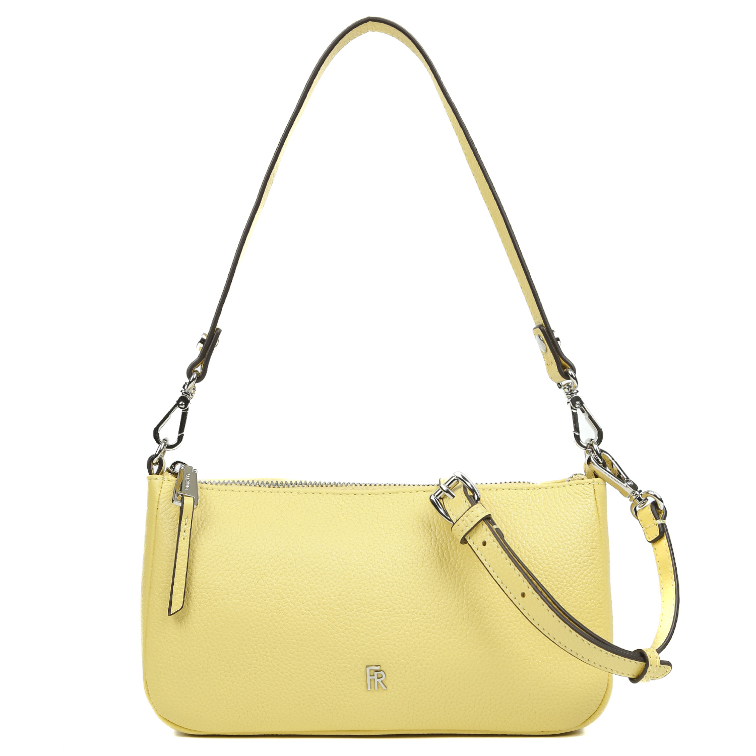 Стильная кросс-боди FABRETTI в желтом оттенке выполнена из натуральной кожи зернистой фактуры. Основное отделение закрывается на молнию с удобным поводком. Внутри 2 кармана для мелочей: на молнии и открытый. На тыльной стороне предусмотрен карман быстрого доступа на молнии. Лицевая сторона декорирована миниатюрной монограммой бренда. В комплекте идут 2 съемных плечевых ремня: длина первого - 50 см, ширина - 2 см; второй - 130 см, регулируется по длине, ширина - 1,5 см. Цвет фурнитуры - серебро.