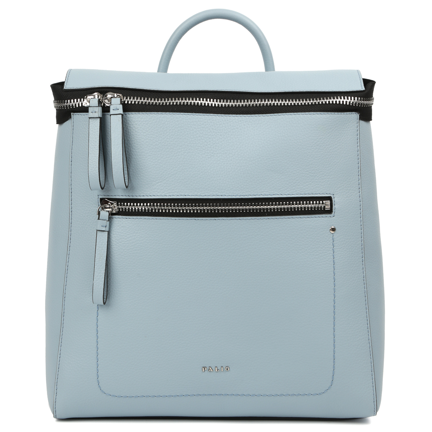 Стильный рюкзак PALIO в голубом оттенке выполнен из натуральной зернистой кожи. Основное отделение закрывается клапаном с крупной молнией с 2 бегунками, концы которой с помощью кнопок пристегиваются к обратной стороне изделия. Внутри 3 боковых кармана для мелочей: 2 открытых и на молнии. На лицевой стороне расположен вместительный карман на молнии. На тыльной стороне предусмотрен открытый прорезной карман быстрого доступа. Сверху есть ручка, позволяющая комфортно носить изделие в руке. 2 лямки шириной 2 см. регулируются по длине и позволяют комфортно носить аксессуар на спине. Цвет фурнитуры - серебро.