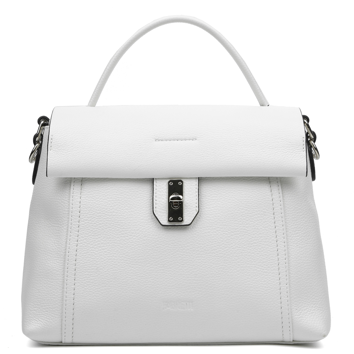 Стильная сумка-сэтчел FABRETTI в белом цвете выполнена из натуральной зернистой кожи. Сумка закрывается клапаном с поворотным замком. Внутри 2 отдела, разделенных средником на молнии, а также 3 кармана для мелочей: 2 открытых и на молнии. На тыльной стороне расположен карман быстрого доступа на молнии. Сверху предусмотрена ручка, позволяющая носить аксессуар в руке или на локте. В комплекте идет съемный плечевой ремень, который регулируется по длине, ширина - 1,5 см. Цвет фурнитуры - серебро.
