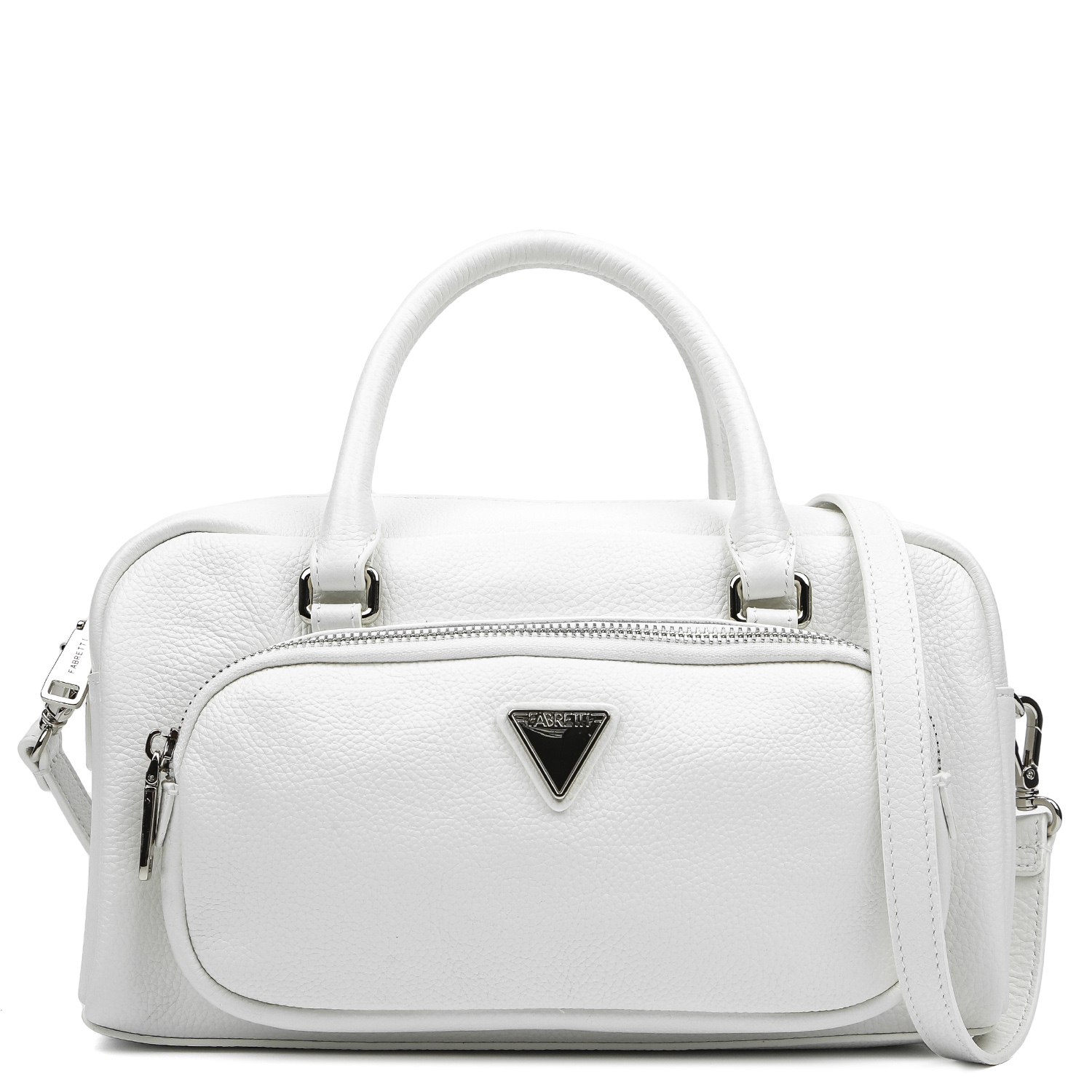 Стильная кросс-боди FABRETTI в белом цвете выполнена из натуральной зернистой кожи. Основное отделение закрывается на полукруглую молнию с металлическим поводком. Внутри 3 кармана для мелочей: 2 открытых и на молнии. На лицевой стороне расположен вместительный накладной карман на молнии. Съемный плечевой ремень регулируется по длине. 2 плотные ручки позволяют носить аксессуар в руке. Цвет фурнитуры - серебро.