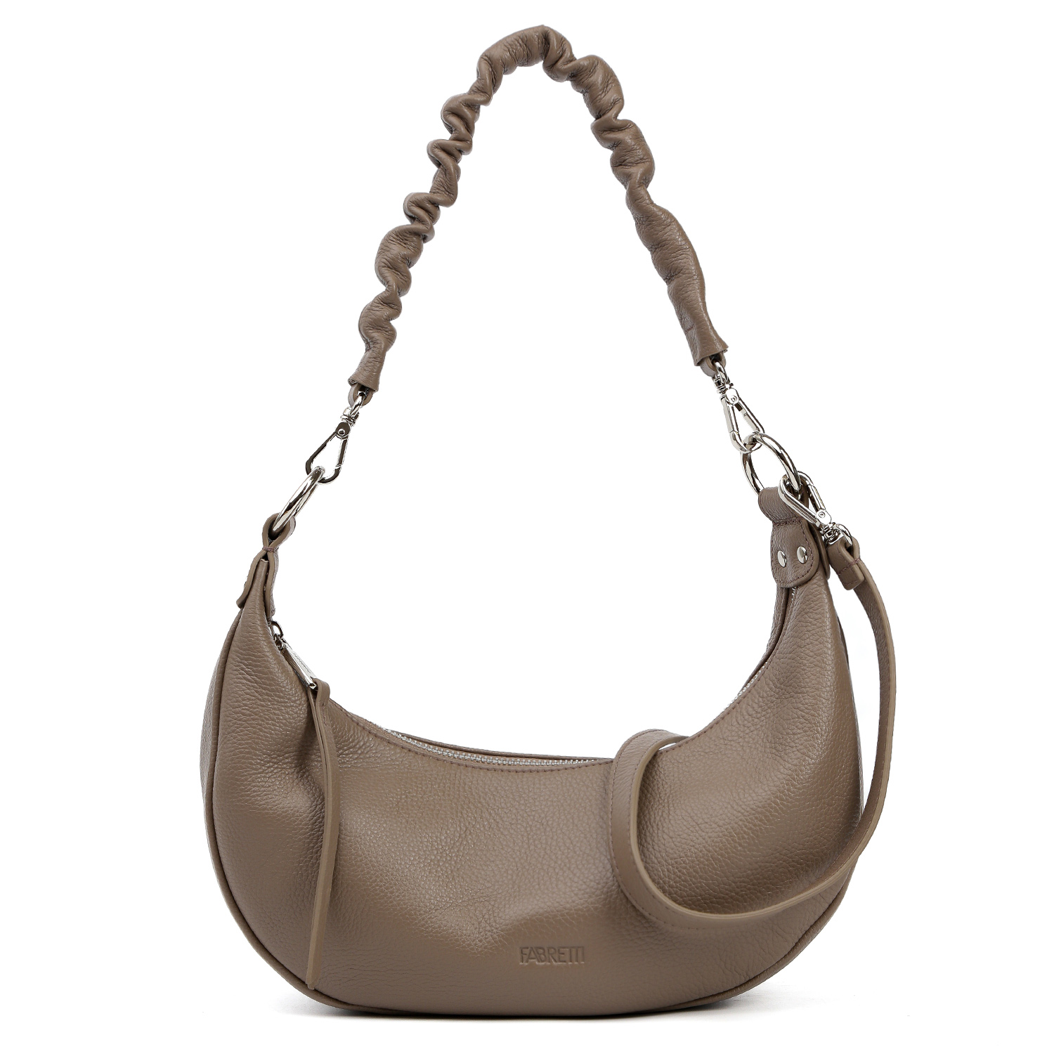 Сумка-хобо FABRETTI в бежевом оттенке выполнена из натуральной зернистой кожи. Основное отделение закрывается на полукруглую молнию с кожаным поводком. Внутри 2 кармана для мелочей: открытый и на молнии. В комплекте 2 съемных плечевых ремня: длина первого - 45 см, ширина – 2,5 см; второй - регулируется по длине, ширина - 3 см. Высота крайних точек - 22 см, высота отделения - 14 см. Цвет фурнитуры - серебро.