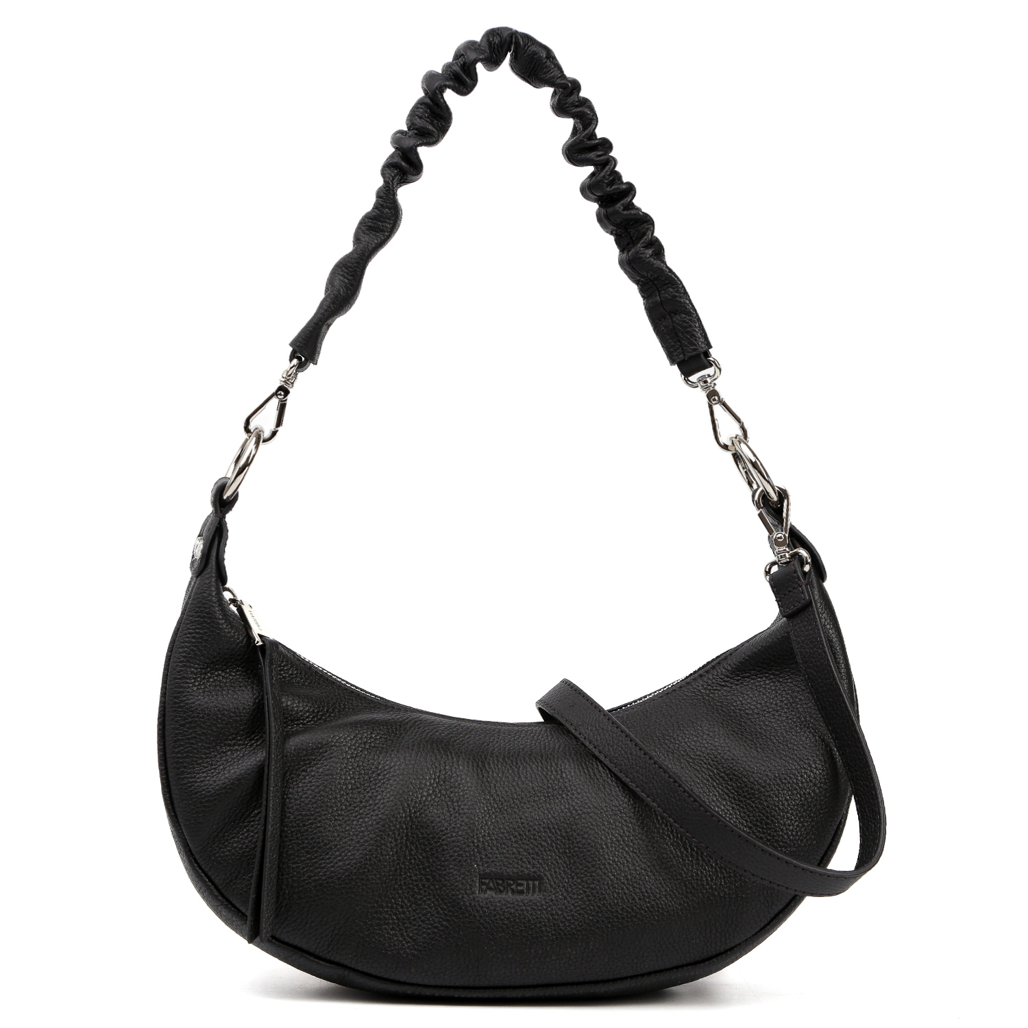 Сумка-хобо FABRETTI в черном цвете выполнена из натуральной зернистой кожи. Основное отделение закрывается на полукруглую молнию с кожаным поводком. Внутри 2 кармана для мелочей: открытый и на молнии. В комплекте 2 съемных плечевых ремня: длина первого - 45 см, ширина – 2,5 см; второй - регулируется по длине, ширина - 3 см. Высота крайних точек - 22 см, высота отделения - 14 см. Цвет фурнитуры - серебро.