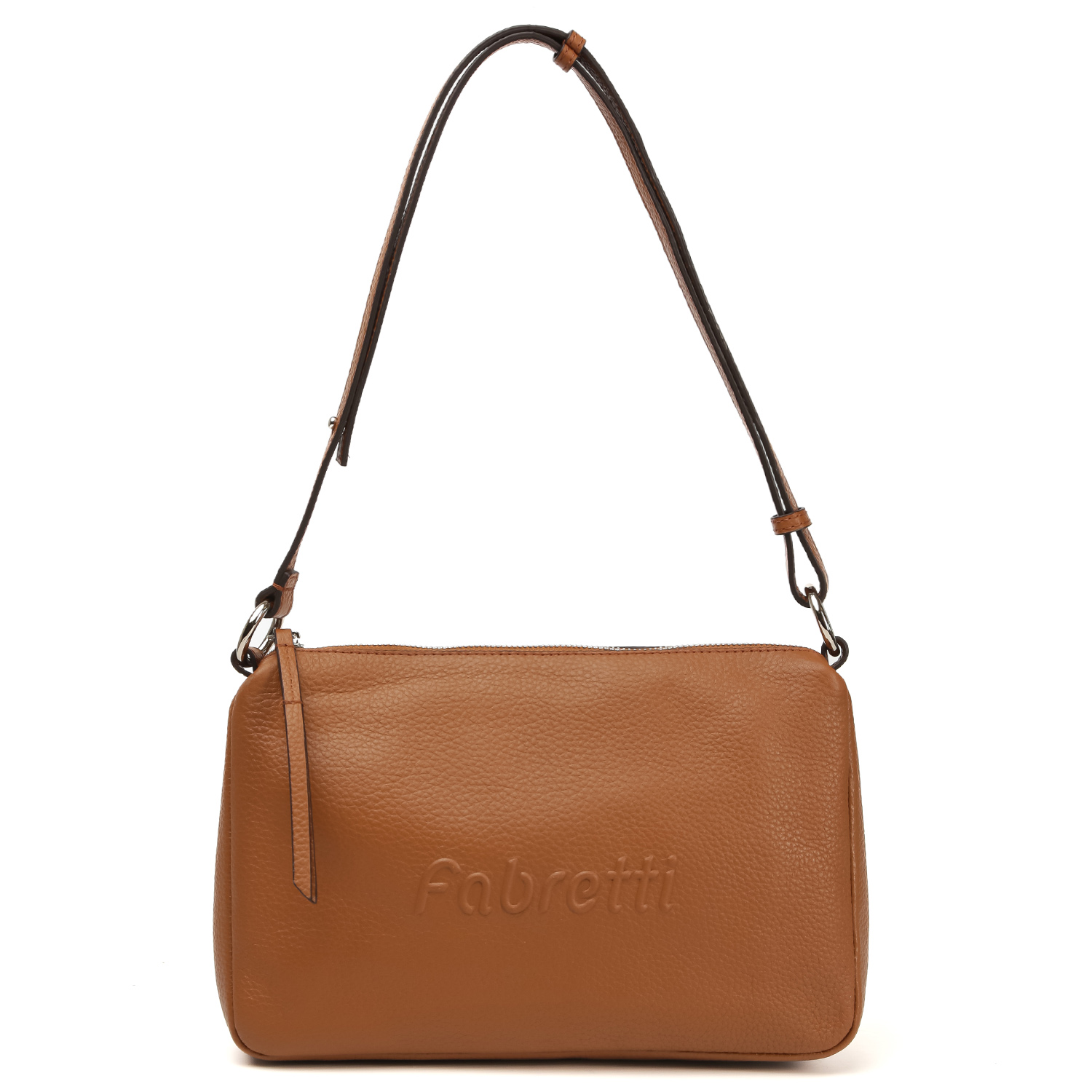 Стильная сумка на плечо FABRETTI в рыжем оттенке выполнена из натуральной зернистой кожи. Лицевая сторона декорирована тиснением с названием бренда. Сумка закрывается на молнию с кожаным поводком. Внутри 2 кармана для мелочей: открытый и на молнии. На тыльной стороне предусмотрен карман быстрого доступа на молнии. Плечевой ремень регулируется по длине, ширина – 1,5 см. Цвет фурнитуры – серебро.
