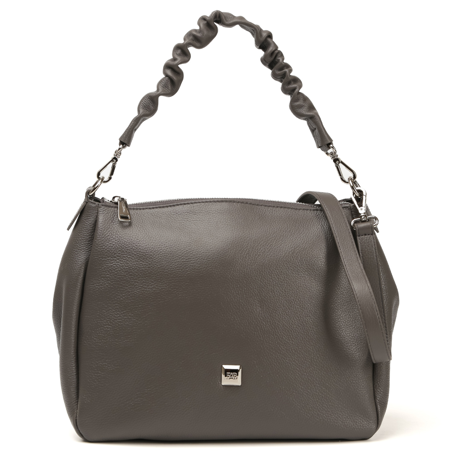 Сумка на плечо FABRETTI в сером оттенке выполнена из натуральной зернистой кожи. Сумка закрывается на молнию. Внутри 2 кармана для мелочей: открытый и на молнии. На тыльной стороне предусмотрен карман быстрого доступа на молнии. В комплекте 2 съемных плечевых ремня: длина первого - 47 см, ширина - 2 см; второй ремень регулируется по длине, ширина - 2 см. Цвет фурнитуры - серебро.