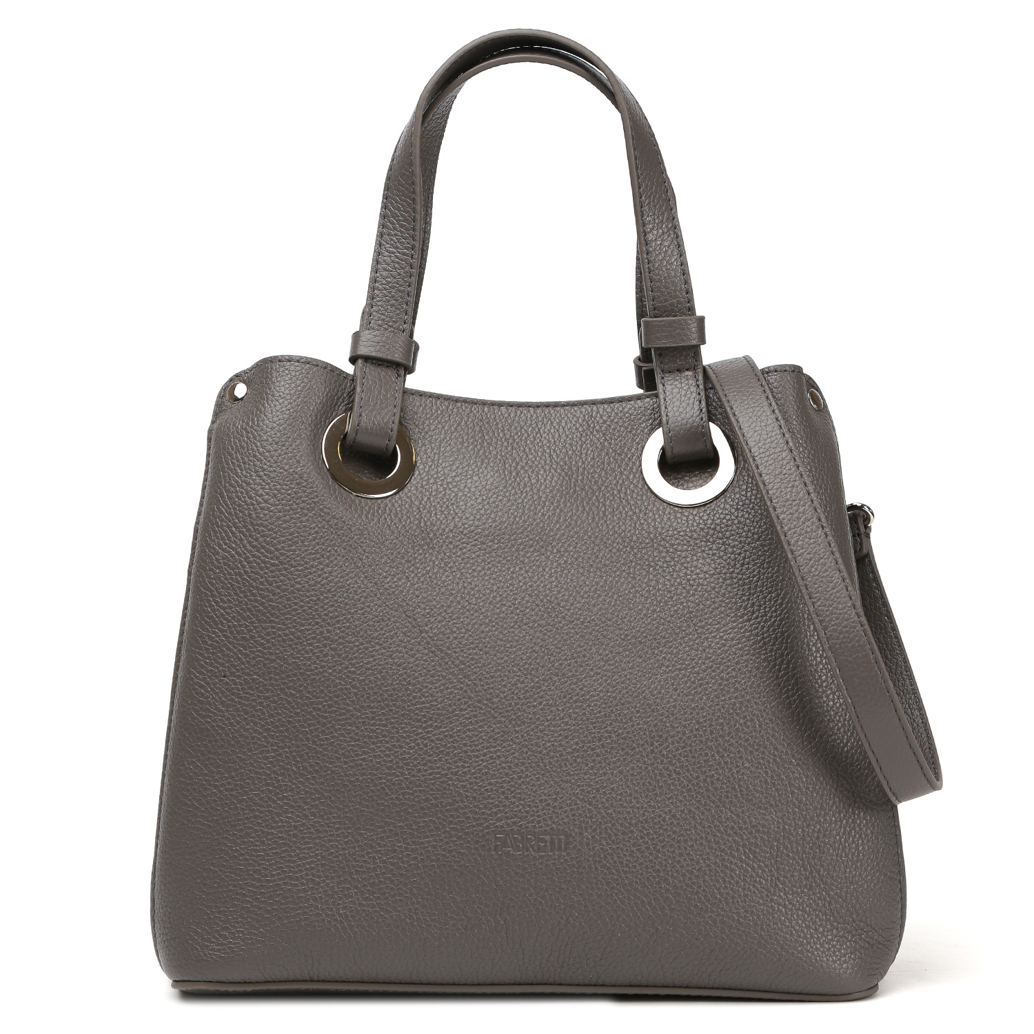 Компактная сумка-тоут FABRETTI в сером оттенке выполнена из натуральной зернистой кожи. Основное отделение закрывается на молнию. Внутри 2 кармана для мелочей: открытый и на молнии. На лицевой и тыльной сторонах расположены дополнительный отделы на магнитной кнопке. Две ручки позволяют комфортно носить аксессуар в руке. Съемный плечевой ремень регулируется по длине, ширина - 2 см. Цвет фурнитуры - серебро.