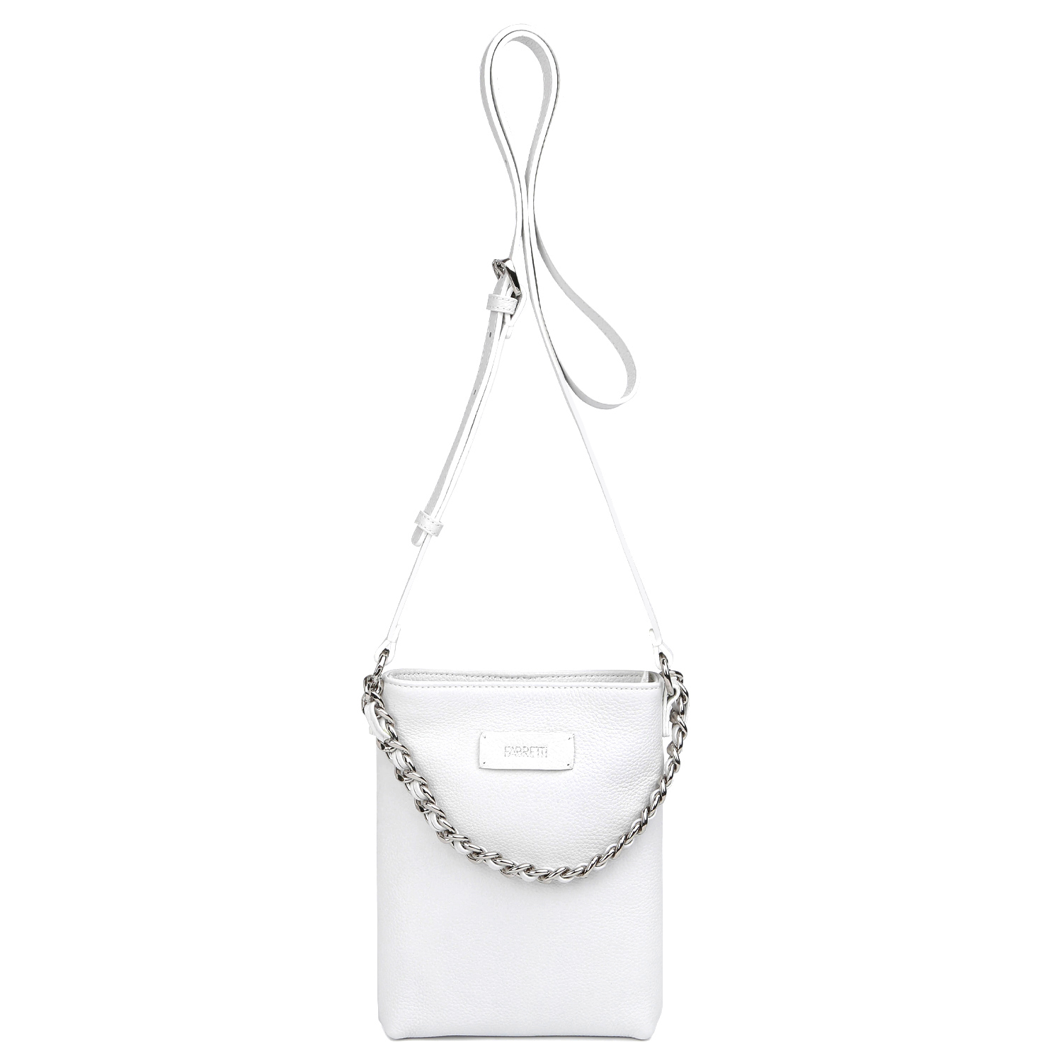 Компактная кросс-боди FABRETTI в белом цвете выполнена из натуральной высококачественной зернистой кожи, приятной на ощупь. Основное отделение закрывается на молнию с металлическим поводком. Внутри есть открытый карман для мелочей. В комплекте 2 съемных плечевых ремня. Ремень-цепочка может быть использован как элемент декора, длина - 36 см, ширина - 2,5 см; второй плечевой ремень регулируется по длине, ширина - 1,5 см. Цвет фурнитуры - серебро.