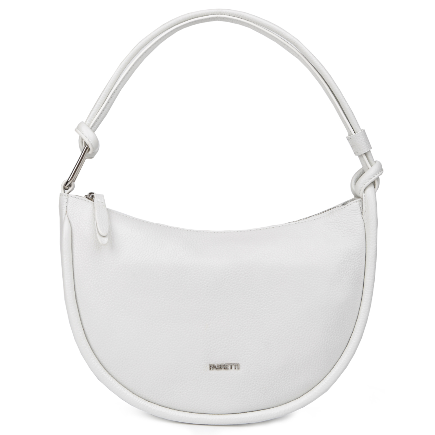 Стильная сумка на плечо FABRETTI в белом цвете выполнена из натуральной высококачественной зернистой кожи, приятной на ощупь. Основное отделение закрывается на молнию с кожаным поводком. Внутри 2 кармана для мелочей: открытый и на молнии. Оригинальный плечевой ремень дополнен металлической пряжкой. Цвет фурнитуры - серебро.