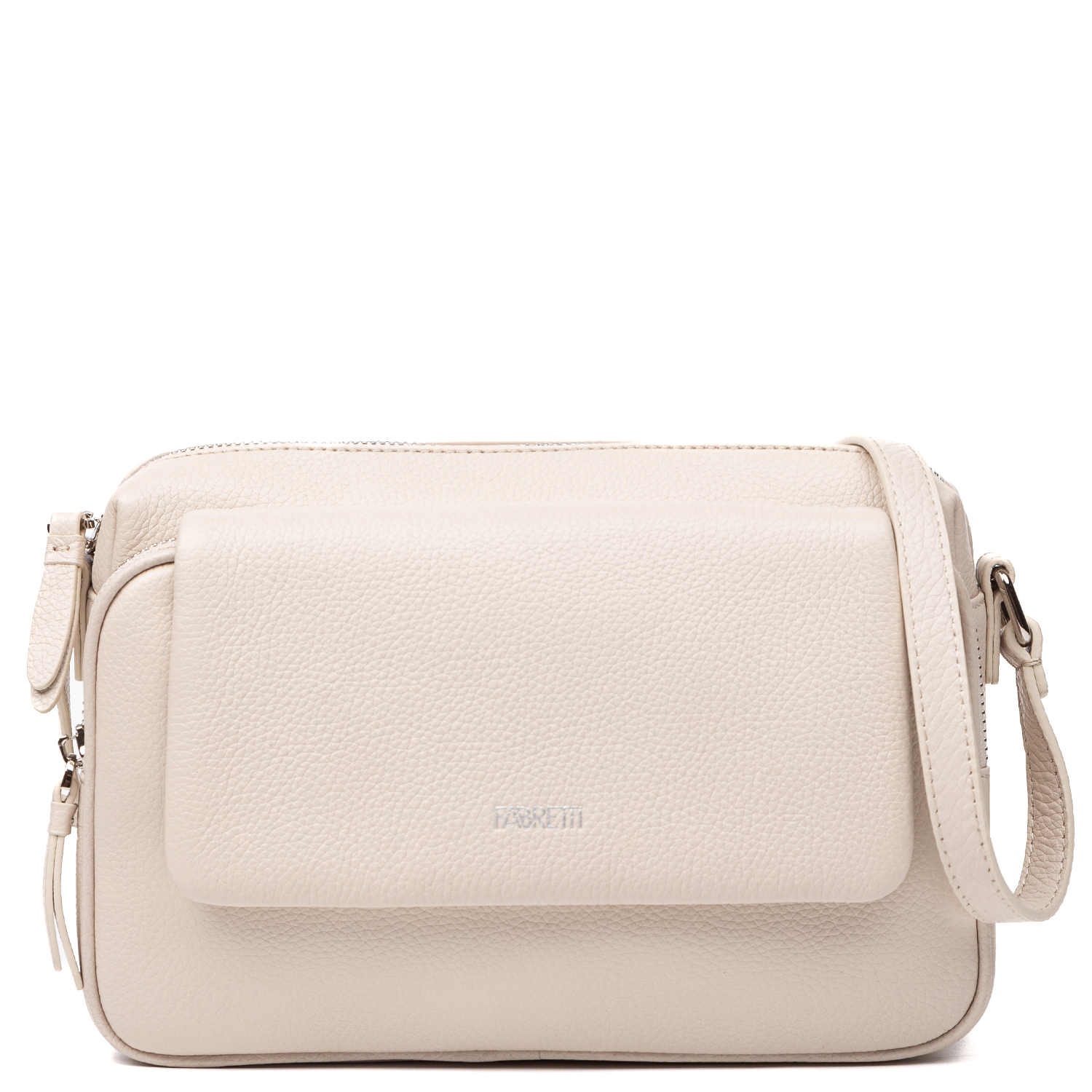 Удобная сумка крос-боди FABRETTI в светло-бежевом оттенке выполнена из натуральной высококачественной зернистой кожи, приятной на ощупь. Основное отделение закрывается на полукруглую молнию с кожаным поводком. Внутри 2 кармана для мелочей: открытый и на молнии. На лицевой стороне расположен вместительный накладной карман на полукруглой молнии, скрытый под клапаном на магнитной кнопке, который обеспечивает надёжное закрытие. На тыльной стороне предусмотрен карман быстрого доступа на молнии. Плечевой ремень регулируется по длине, ширина - 1,5 см. Цвет фурнитуры - серебро.