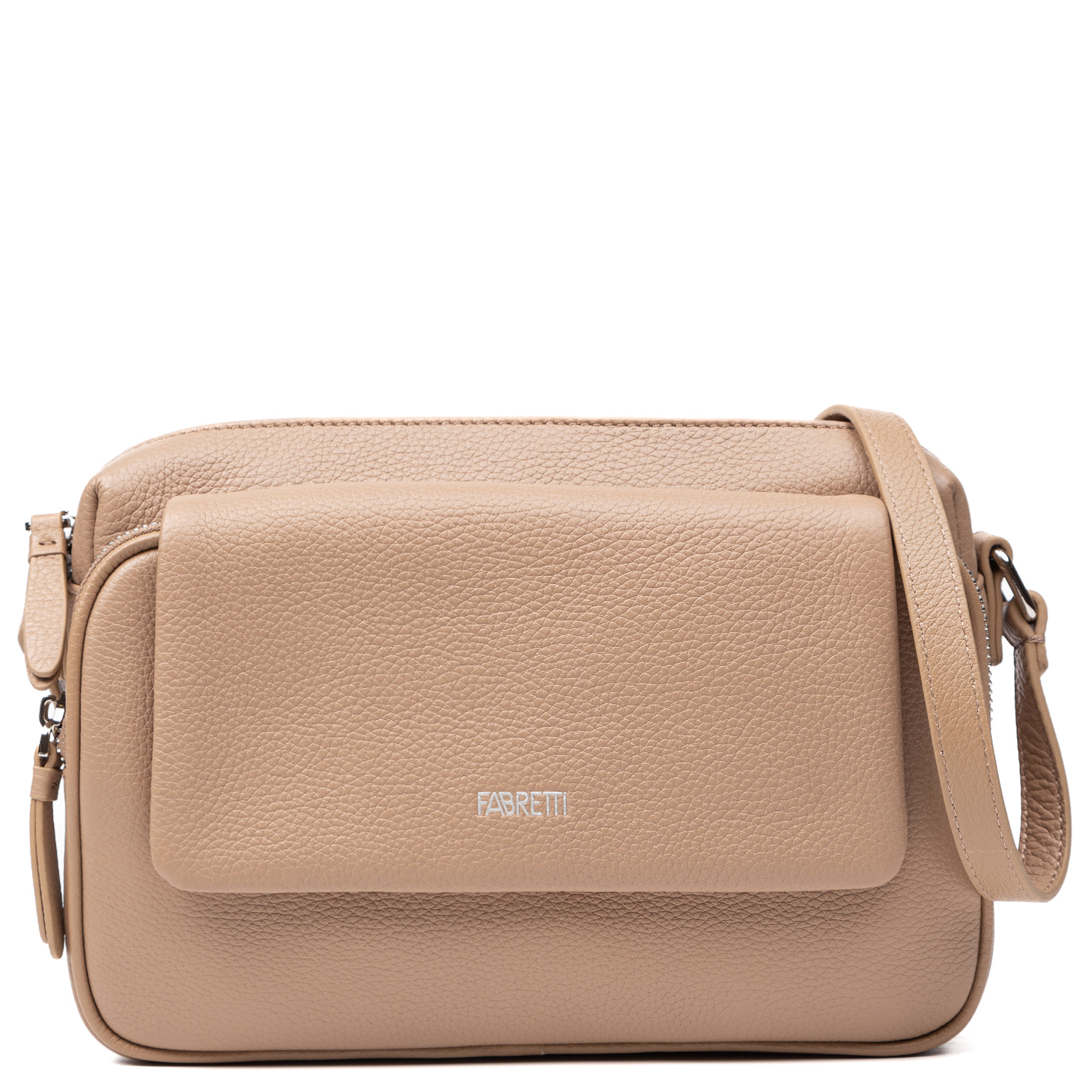 Удобная сумка крос-боди FABRETTI в бежевом оттенке выполнена из натуральной высококачественной зернистой кожи, приятной на ощупь. Основное отделение закрывается на полукруглую молнию с кожаным поводком. Внутри 2 кармана для мелочей: открытый и на молнии.На лицевой стороне расположен вместительный накладной карман на полукруглой молнии, скрытый под клапаном на магнитной кнопке, который обеспечивает надёжное закрытие. На тыльной стороне предусмотрен карман быстрого доступа на молнии. Плечевой ремень регулируется по длине, ширина - 1,5 см. Цвет фурнитуры - серебро.