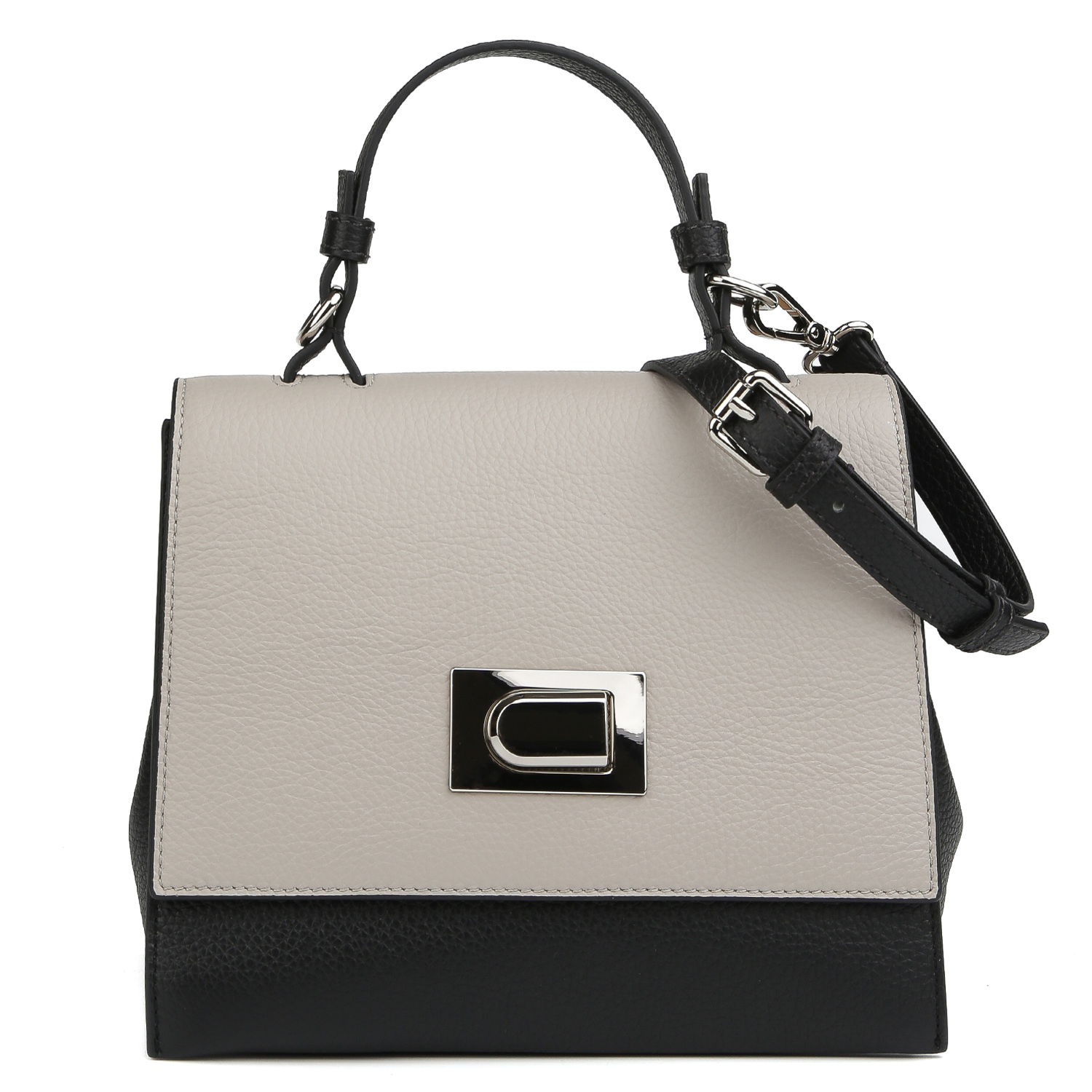 Стильная сумка-сэтчел FABRETTI в черно-сером цвете выполнена из натуральной высококачественной зернистой кожи, приятной на ощупь. Основное отделение закрывается клапаном с магнитной кнопкой. Внутри 3 кармана для мелочей: 2 открытых и на молнии. Лицевая сторона декорирована изысканной фурнитурой. Ручка сверху позволяет комфортно носить аксессуар в руке. Съемный плечевой ремень регулируется по длине. Цвет фурнитуры - серебро.