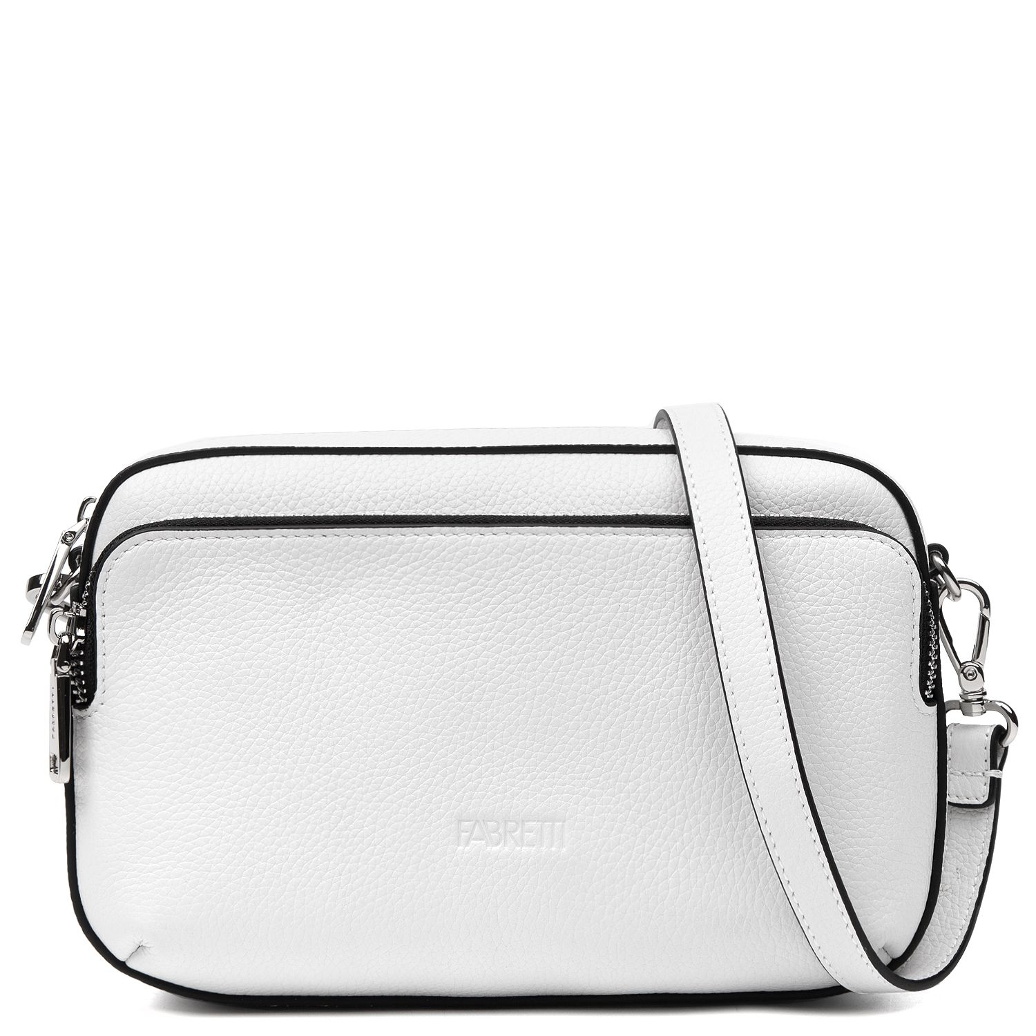 Компактная сумка кросс-боди FABRETTI в белом цвете выполнена из натуральной высококачественной зернистой кожи, приятной на ощупь. Основное отделение закрывается на полукруглую молнию с металлическим поводком. Внутри 2 кармана для мелочей: открытый и на молнии. На лицевой стороне есть накладной карман на полукруглой молнии. На тыльной стороне предусмотрен открытый карман быстрого доступа. Плечевой ремень регулируется по длине, ширина - 1,5 см. Цвет фурнитуры - серебро.