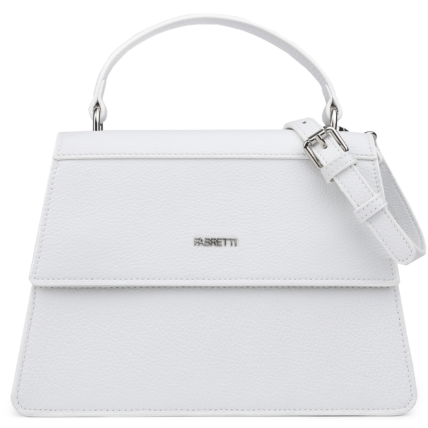 Стильная сумка-сэтчел FABRETTI в белом цвете выполнена из натуральной высококачественной зернистой кожи, приятной на ощупь. Основное отделение закрывается клапаном с магнитной кнопкой. Лицевая сторона декорирована фурнитурой с названием бренда. Ручка сверху позволяет комфортно носить аксессуар в руке. Съемный плечевой ремень регулируется по длине. Цвет фурнитуры - серебро.
