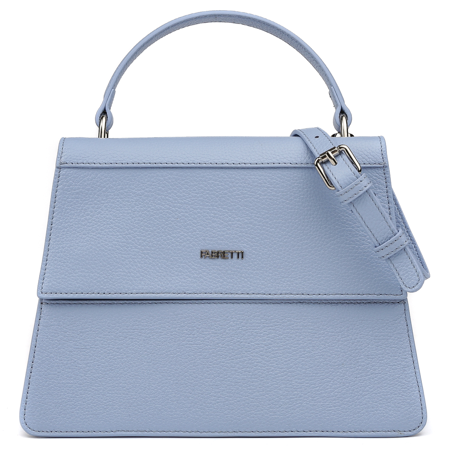 Стильная сумка-сэтчел FABRETTI в светло-голубом цвете выполнена из натуральной высококачественной зернистой кожи, приятной на ощупь. Основное отделение закрывается клапаном с магнитной кнопкой. Лицевая сторона декорирована фурнитурой с названием бренда. Ручка сверху позволяет комфортно носить аксессуар в руке. Съемный плечевой ремень регулируется по длине. Цвет фурнитуры - серебро.