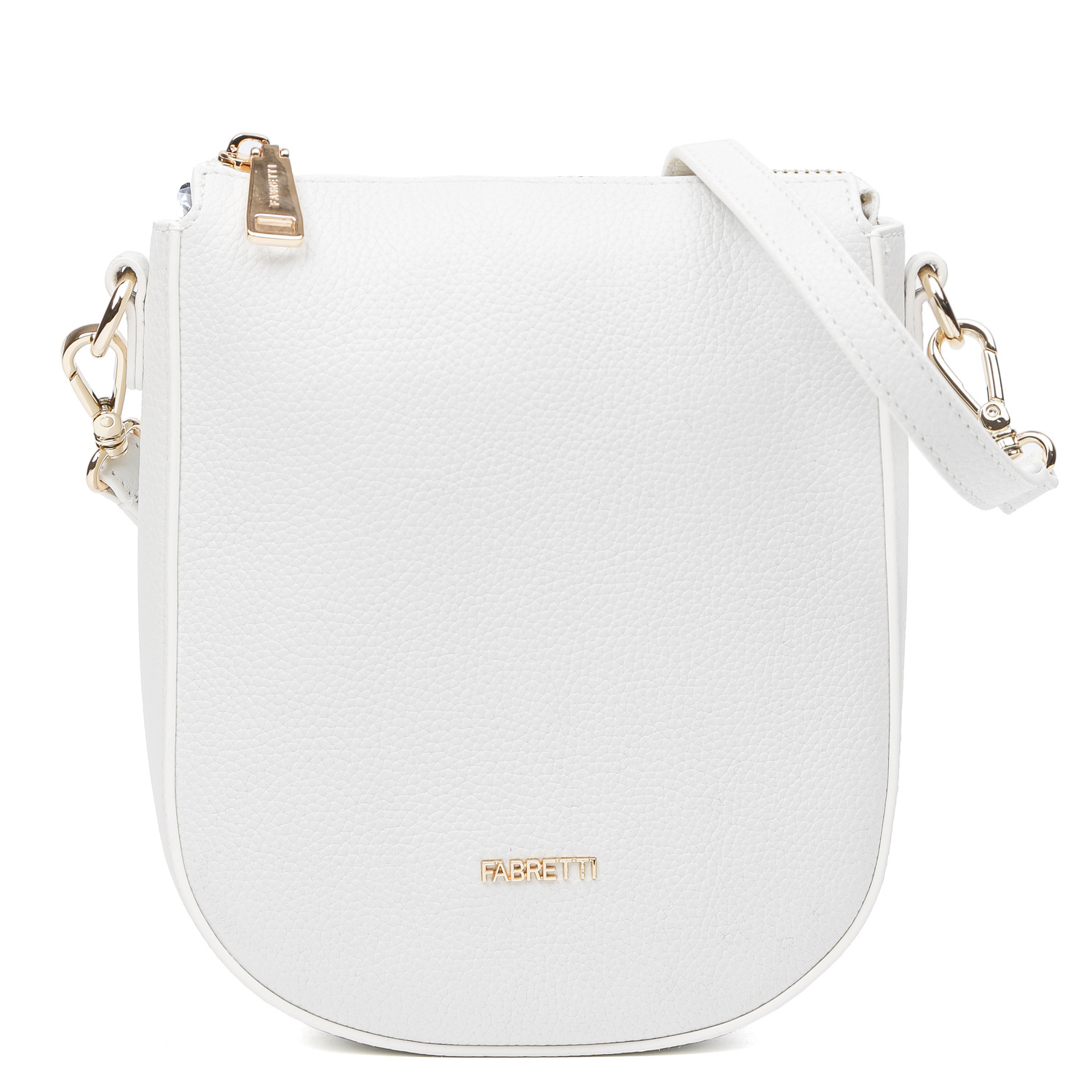 Компактная сумка кросс-боди FABRETTI в белом цвете выполнена из натуральной высококачественной зернистой кожи, приятной на ощупь. Сумка закрывается на молнию с металлическим поводком. Внутри есть открытый карман для мелочей. Съемный плечевой ремень регулируется по длине, ширина - 1,5 см. Цвет фурнитуры - золото.