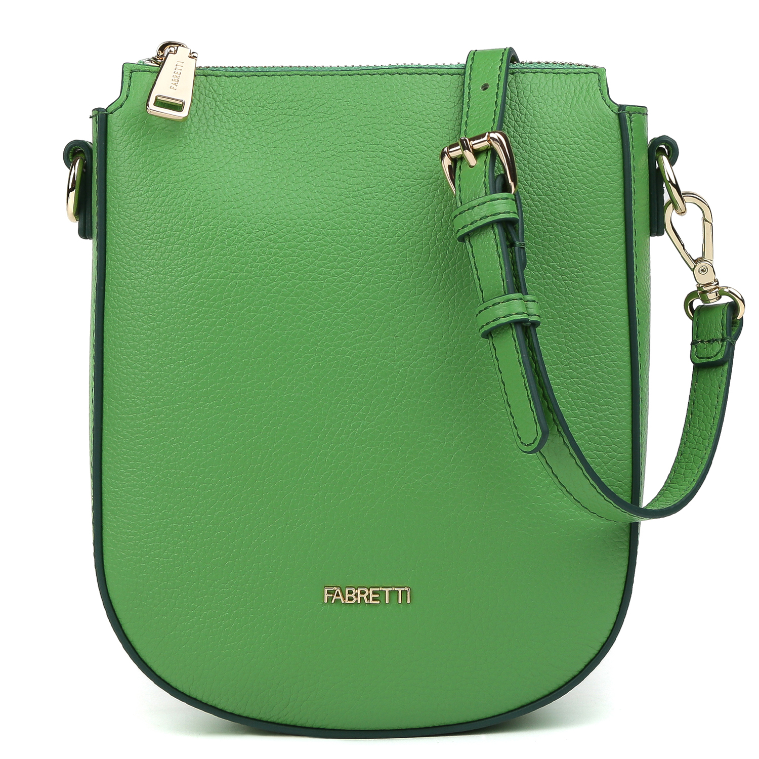 Компактная сумка кросс-боди FABRETTI в зеленом цвете выполнена из натуральной высококачественной зернистой кожи, приятной на ощупь. Сумка закрывается на молнию с металлическим поводком. Внутри есть открытый карман для мелочей. Съемный плечевой ремень регулируется по длине, ширина - 1,5 см. Цвет фурнитуры - золото.
