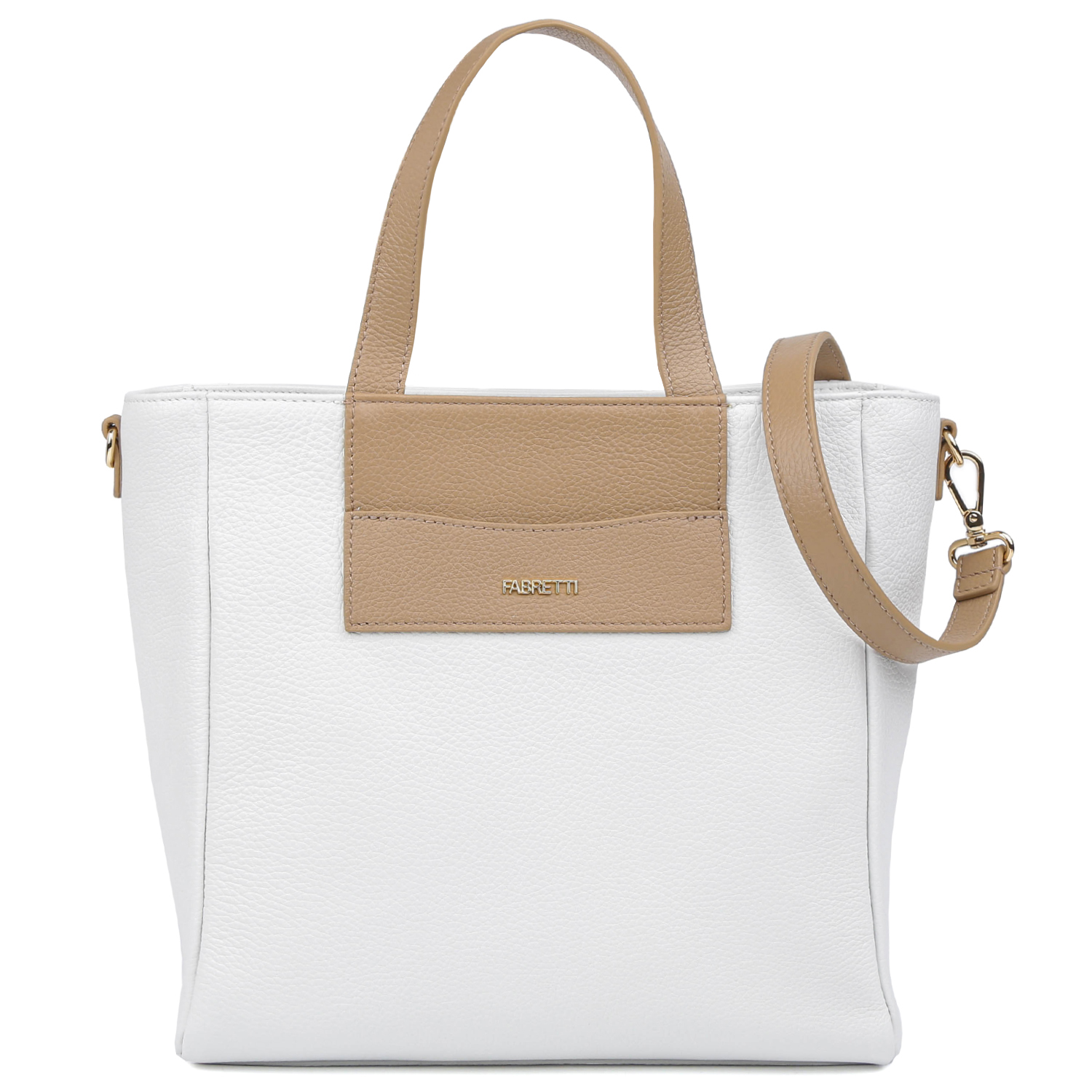 Стильная сумка-тоут FABRETTI выполнена из натуральной высококачественной зернистой кожи, приятной на ощупь и гармонично сочетает белый и бежевый оттенки. Сумка закрывается на молнию с кожаным поводком. Внутри 2 отдела, разделенные карманом на молнии, а также 2 кармана для мелочей: открытый и на молнии. На тыльной стороне предусмотрен карман быстрого доступа на молнии. Две ручки позволяют комфортно носить аксессуар в руке. Съемный плечевой ремень регулируется по длине, ширина - 2 см. Цвет фурнитуры - золото.