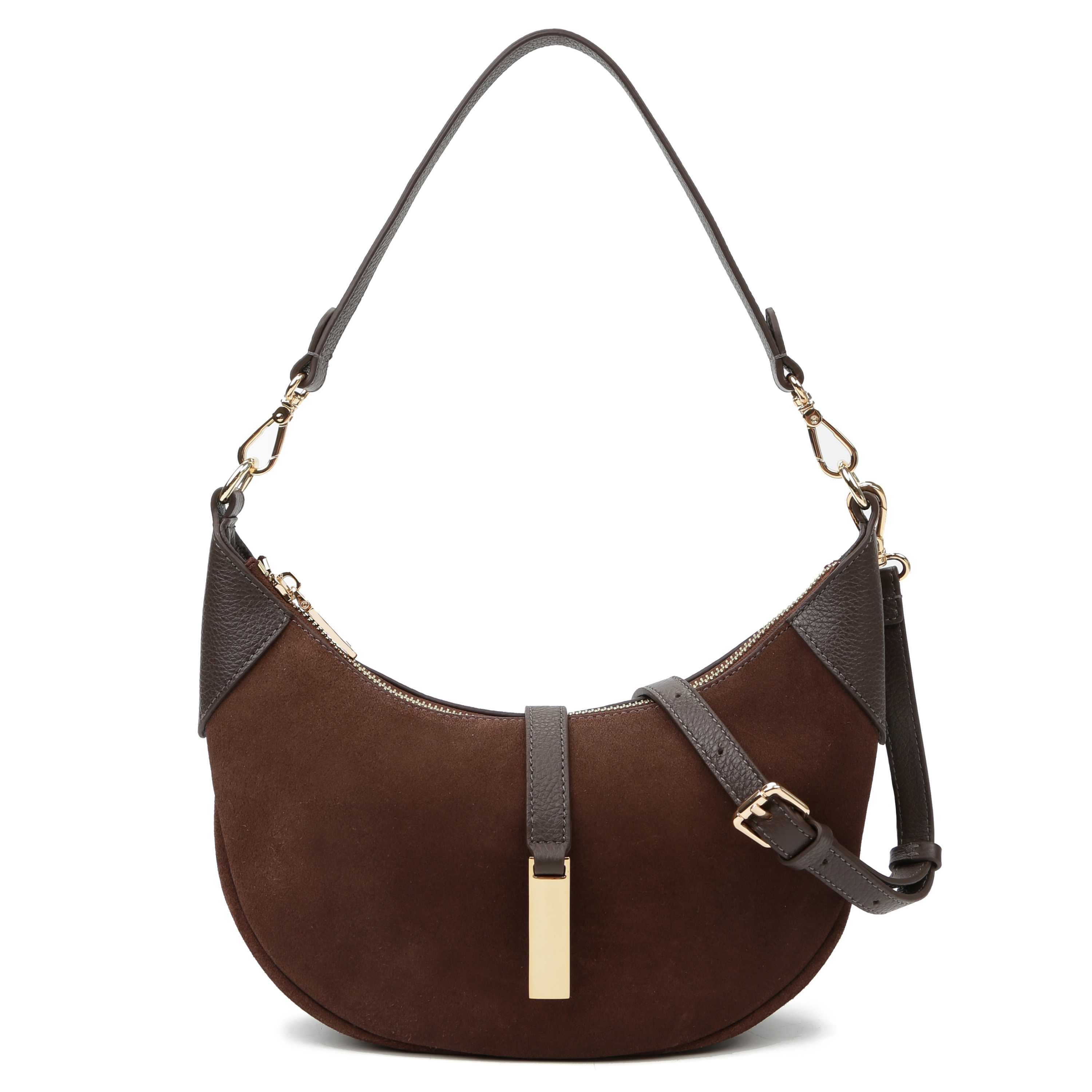 Сумка FABRETTI благородного коричневого оттенка, выполнена из натуральной высококачественной замши. Основное отделение закрывается на молнию, внутри - два кармана: на молнии и быстрого доступа. В комплекте два ремня: один для ношения на плече и один с пряжкой для ношения через плечо. Длина ремня - 131 см, ширина - 1.5 см. Украшает сумку ремешок с металлической подвеской. Вся фурнитура - золотого цвета. Материал подкладки: полиэстер.