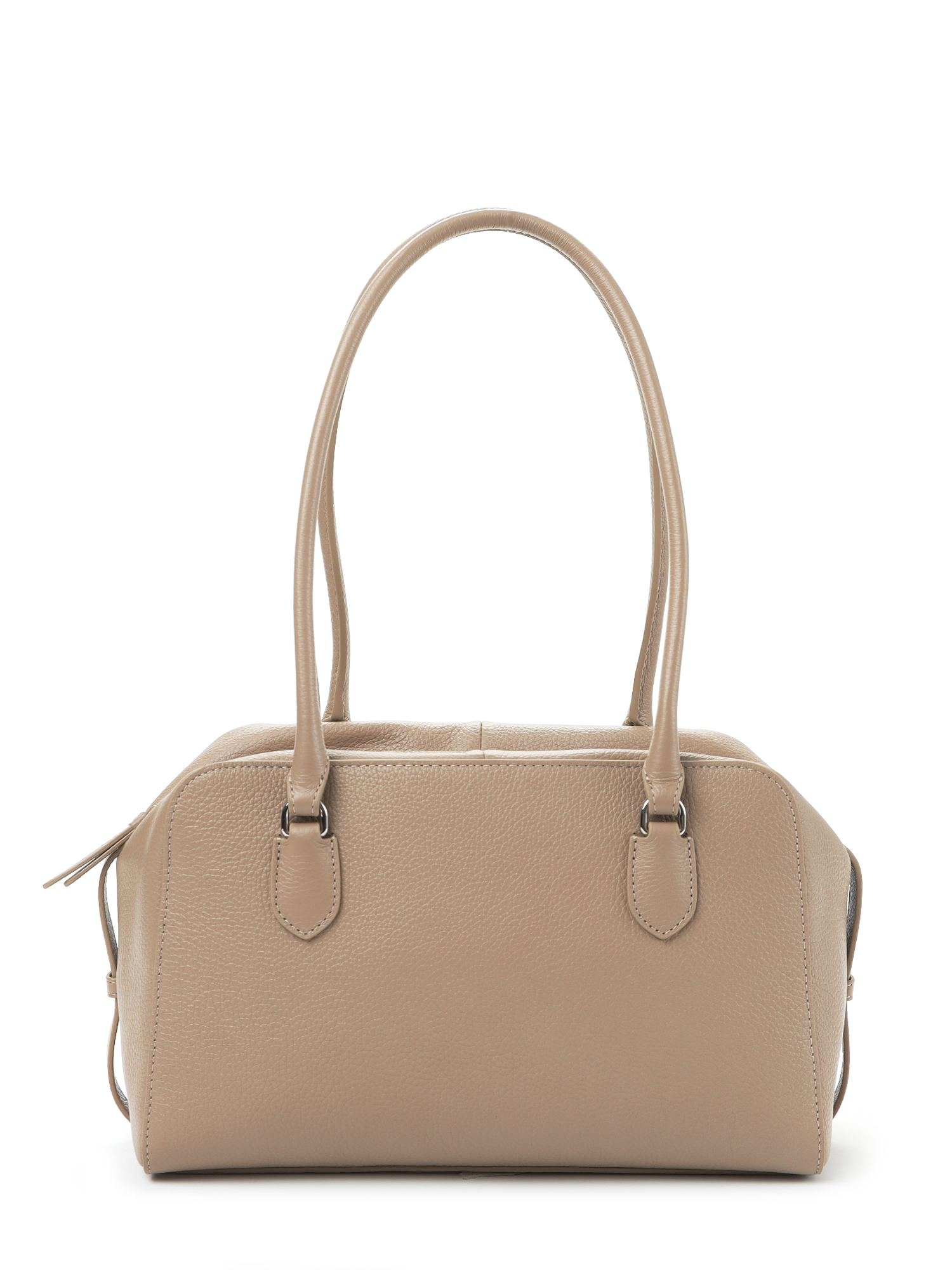 Модель выполнена из натуральной кожи кофейно-бежевого оттенка с зернистой фактурой. Основное отделение закрывается на металлическую молнию. Внутри расположены открытый карман и на молнии.