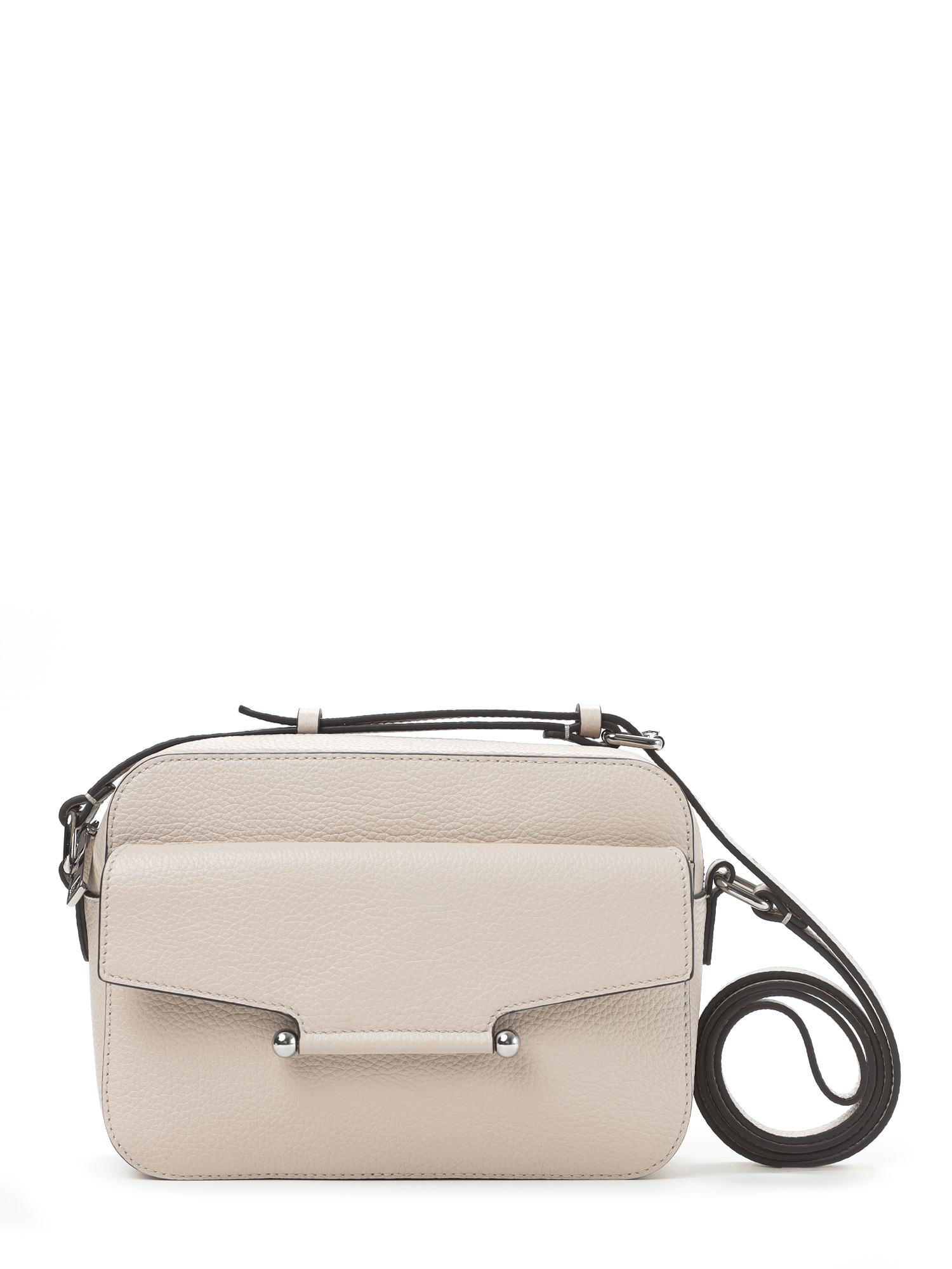 Небольшая прямоугольная женская сумка кросс-боди итальянского бренда FABRETTI из высококачественной натуральной кожи с мелкозернистой фактурой в светло-бежевом цвете с контрастной черной окантовкой краев.