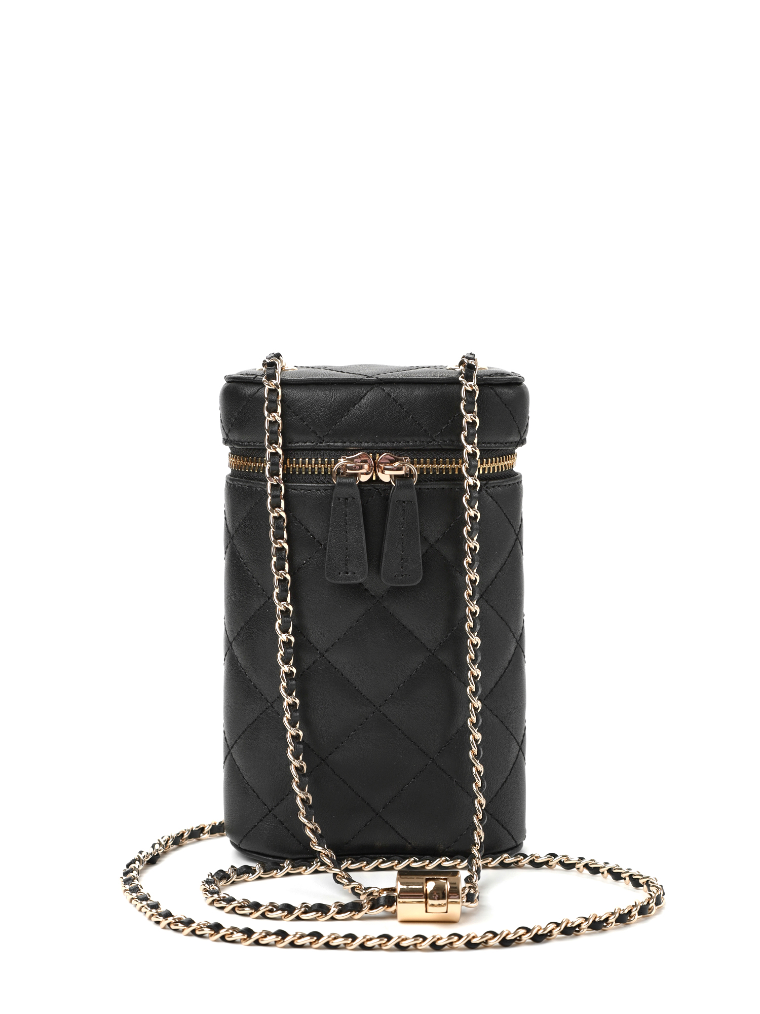 Необычная женская сумка кросс-боди итальянского бренда FABRETTI в ретро-стиле это изысканный аксессуар, который любой образ сделает более выразительным и индивидуальным. Модель выполнена из мягкой кожи наппа черного цвета с отстрочкой ромбами и имеет жесткий каркас. Закрывается клапаном-крышкой на круглой металлической молнии с двумя бегунками. К крышке крепится длинная и тонкая металлическая цепочка, отделанная кожаным шнуром. Длина цепочки регулируется замком.
